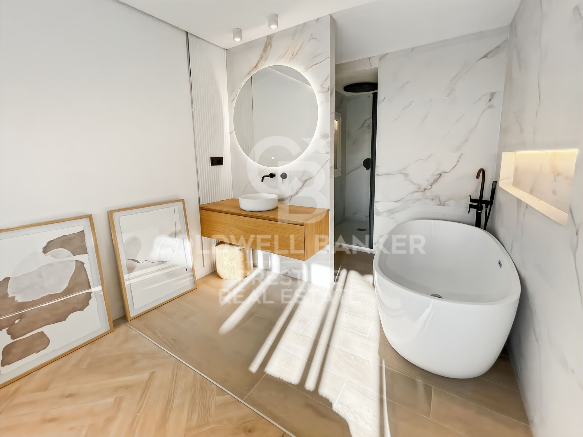 Die Wohnung verfügt über zwei elegante Suiten mit Westausrichtung, ideal, um das natürliche Licht und atemberaubende Sonnenuntergänge täglich zu genießen. Beide Zimmer sind mit Einbauschränken ausgestattet: eines mit Dusche und das andere mit Dusche und Badewanne und bieten Komfort und Privatsphäre. Zusätzlich gibt es ein Gäste-WC im Eingangsbereich, perfekt, um Besucher bequem zu empfangen.