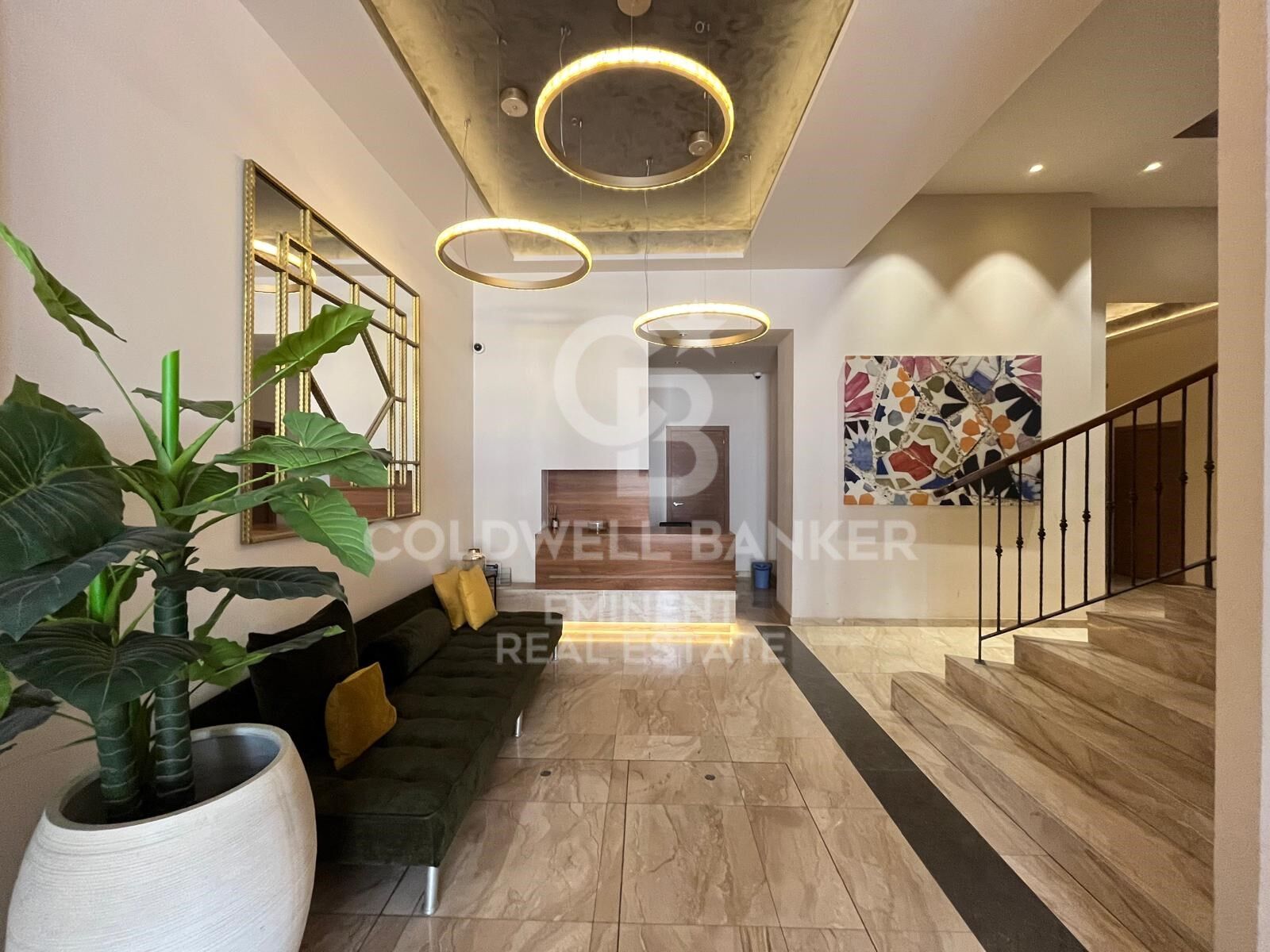Hervorzuheben ist das großzügige, helle Wohn-Esszimmer mit modernem Design, das in eine offene Küche im amerikanischen Stil integriert ist, ausgestattet mit hochwertigen Geräten: Backofen, Kühlschrank, Geschirrspüler, Mikrowelle, Waschmaschine und Trockner. Der Wohnbereich öffnet sich zu zwei Außenbalkonen, die viel Tageslicht hereinlassen und einen herrlichen Blick auf die lebendige Umgebung bieten.