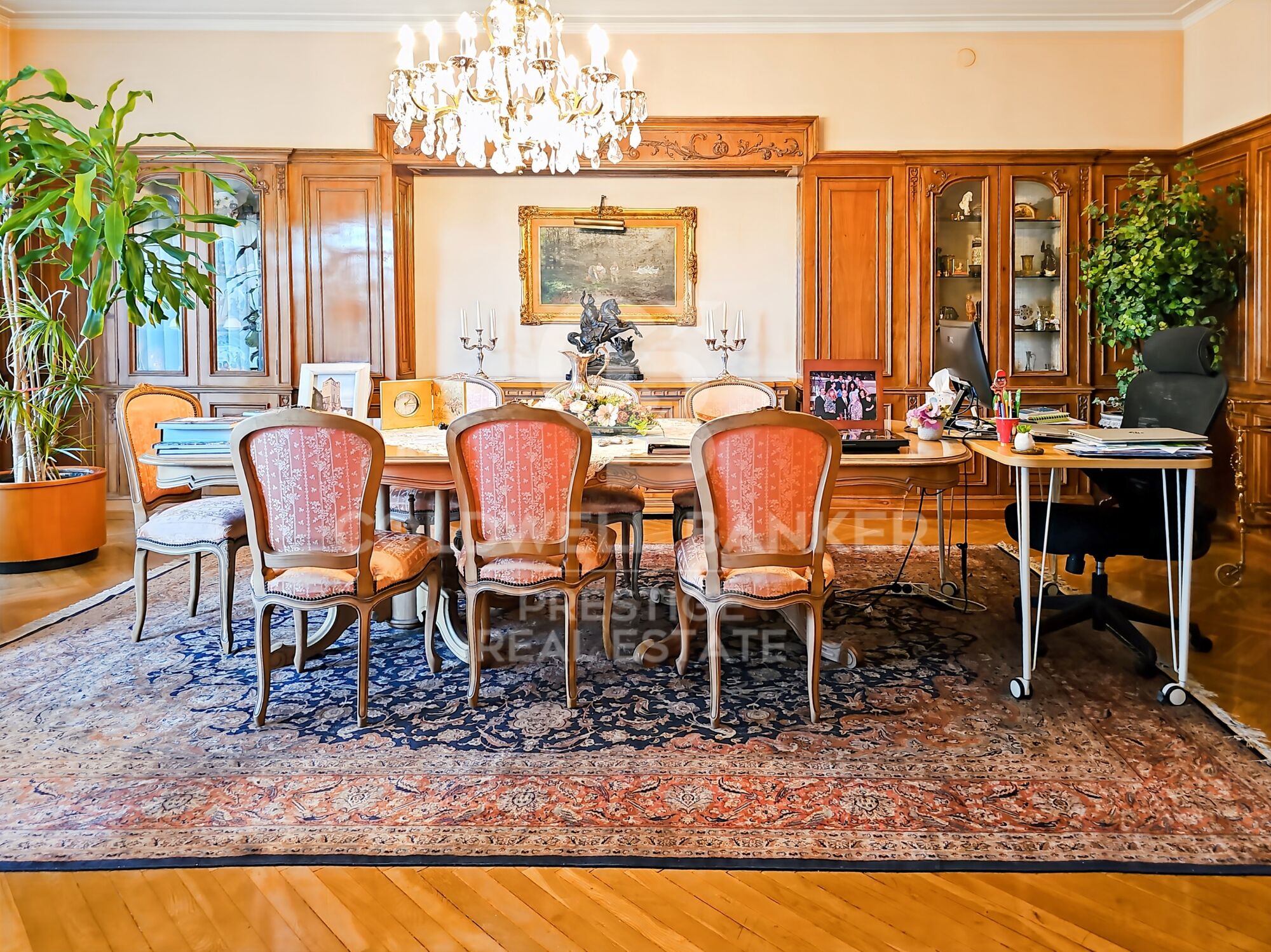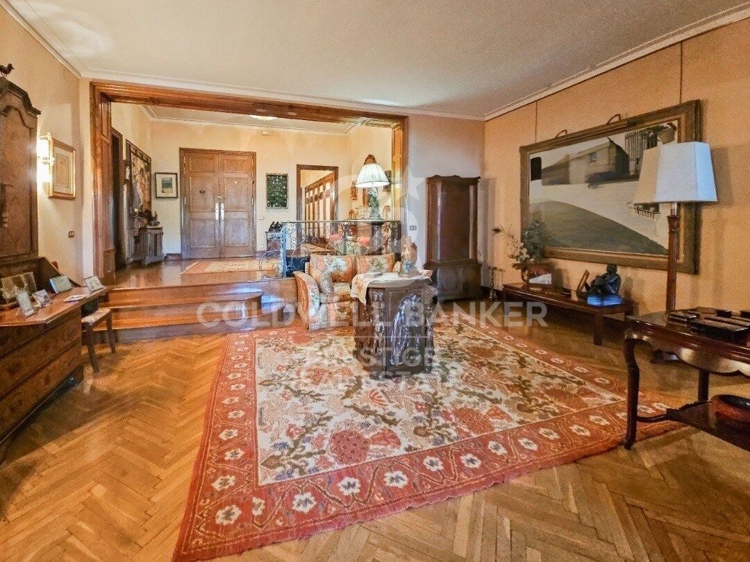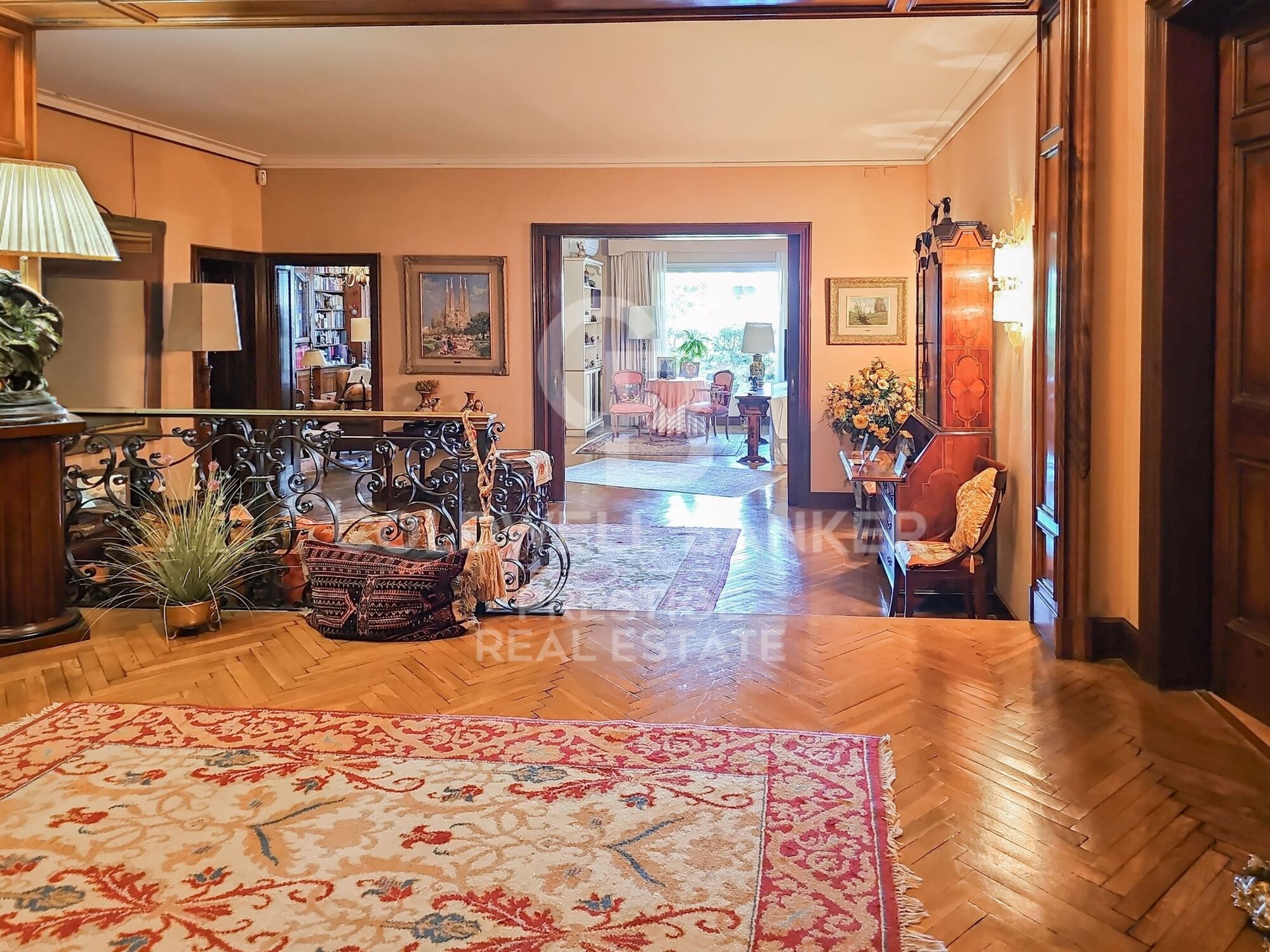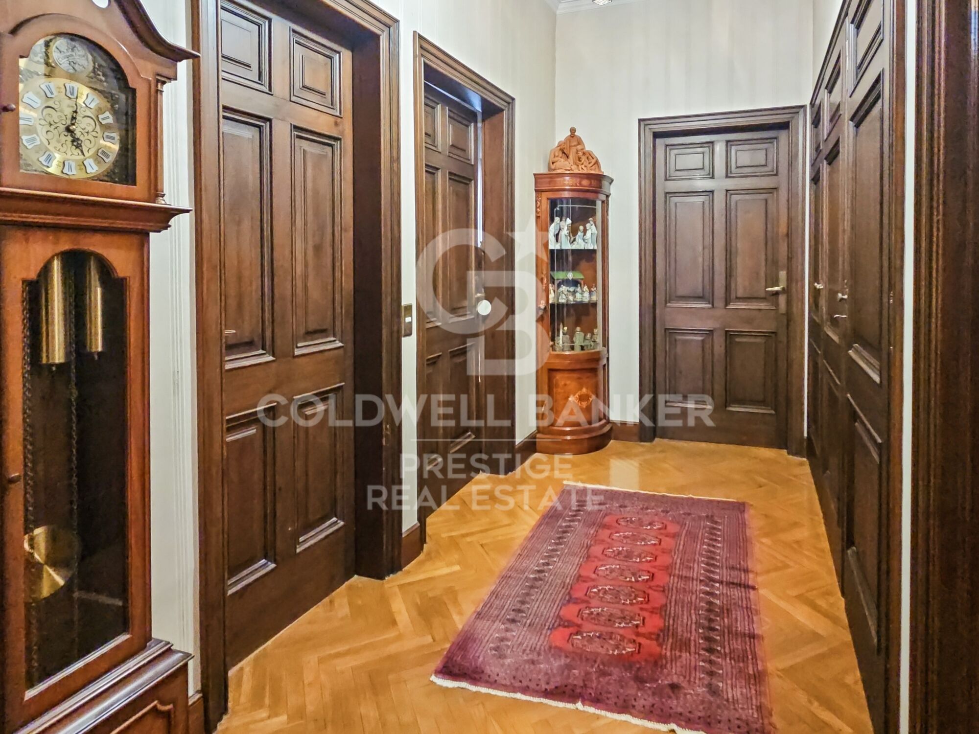 Das Haus mit quadratischem Grundriss dreht sich um eine elegante zentrale Halle, eine Besonderheit des renommierten Architekten Mitjans. Von dort führt eine Treppe hinauf zum beeindruckenden Hauptwohnzimmer, das über 100 m² groß und in mehrere Bereiche unterteilt ist: Wohnzimmer, Bibliothek und Esszimmer, die alle mit maßgefertigten Möbeln aus edlen Hölzern, zwei Kaminen und Zugang zu einer herrlichen Terrasse mit Blick auf die Gärten des Turó Parc ausgestattet sind.