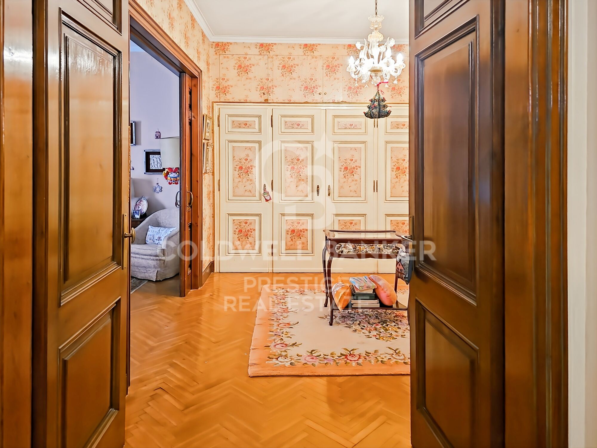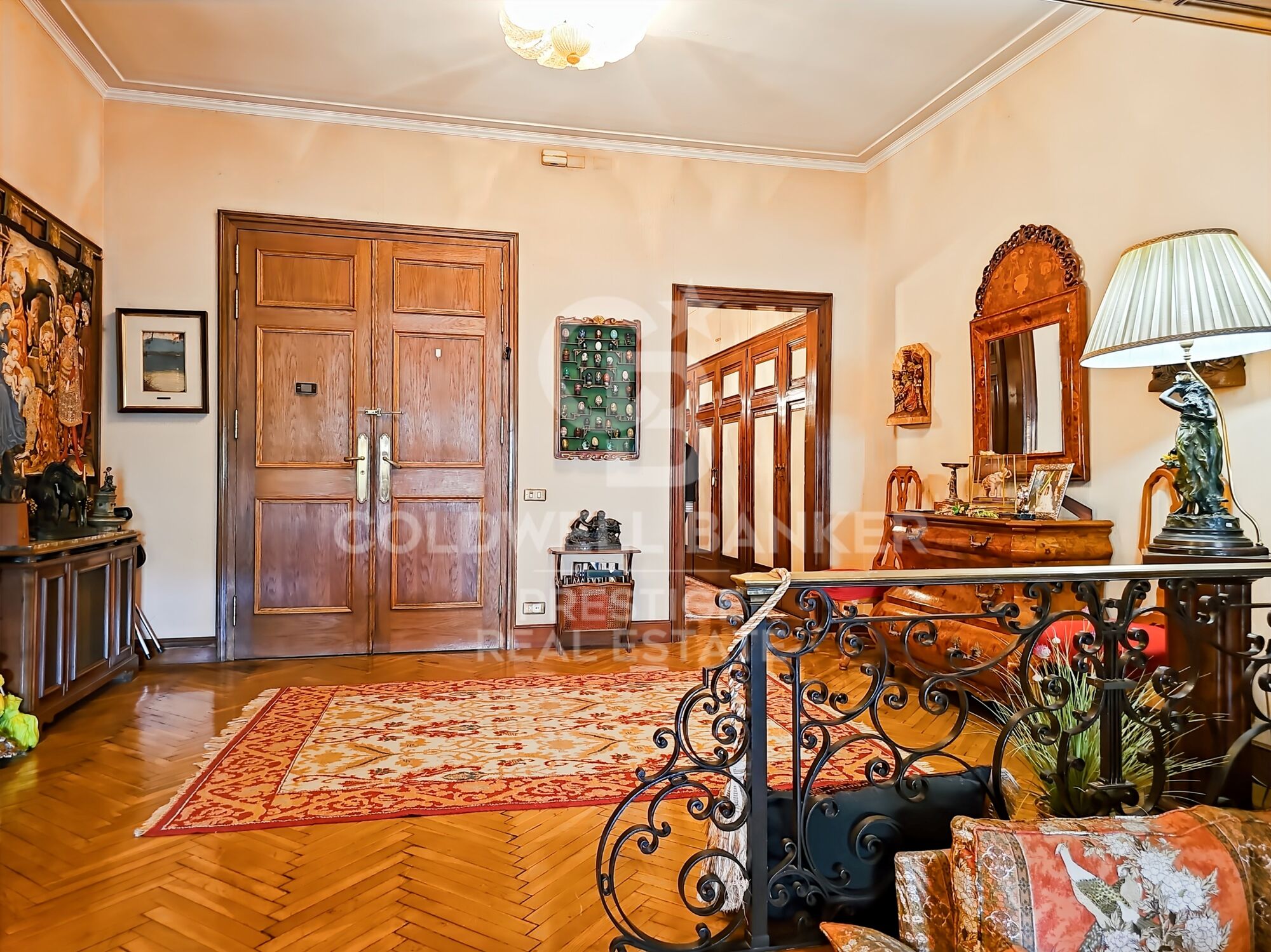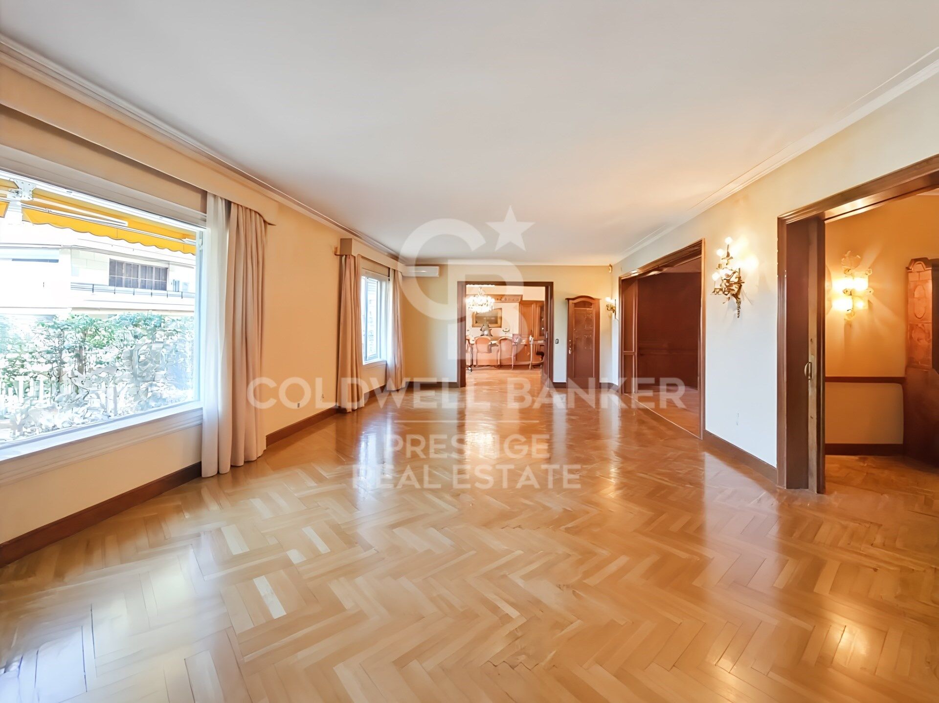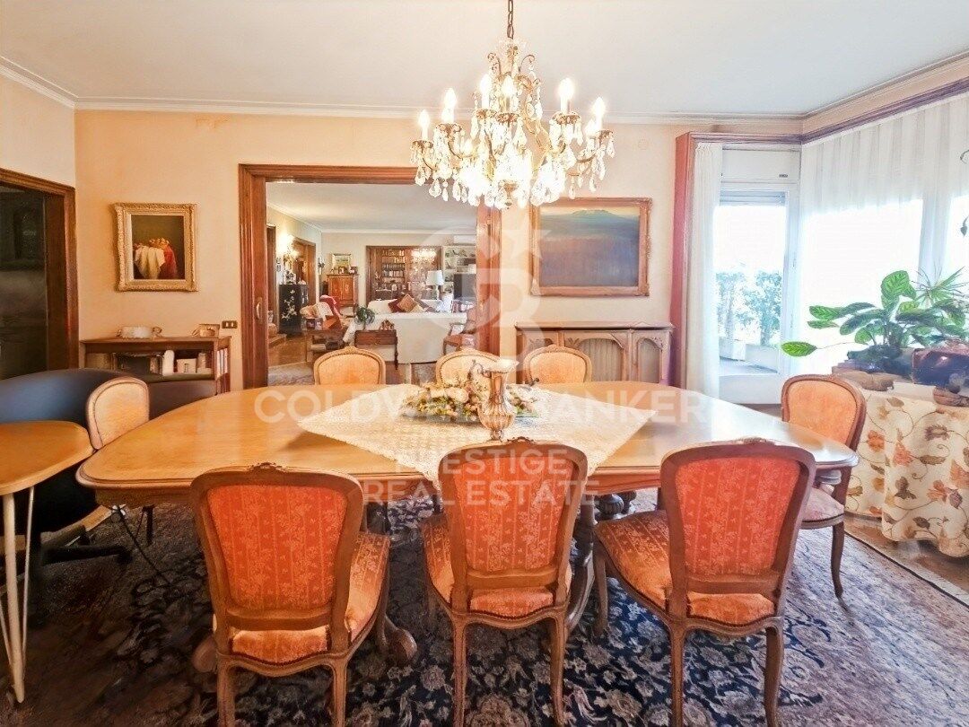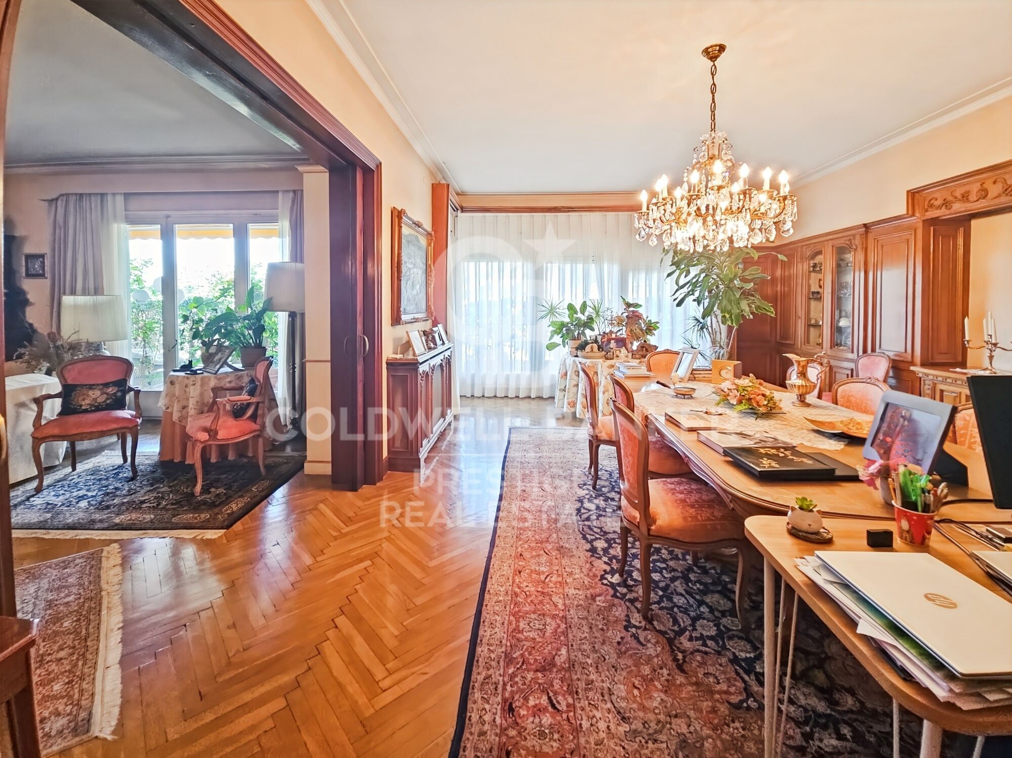 Das Haus mit quadratischem Grundriss dreht sich um eine elegante zentrale Halle, eine Besonderheit des renommierten Architekten Mitjans. Von dort führt eine Treppe hinauf zum beeindruckenden Hauptwohnzimmer, das über 100 m² groß und in mehrere Bereiche unterteilt ist: Wohnzimmer, Bibliothek und Esszimmer, die alle mit maßgefertigten Möbeln aus edlen Hölzern, zwei Kaminen und Zugang zu einer herrlichen Terrasse mit Blick auf die Gärten des Turó Parc ausgestattet sind.