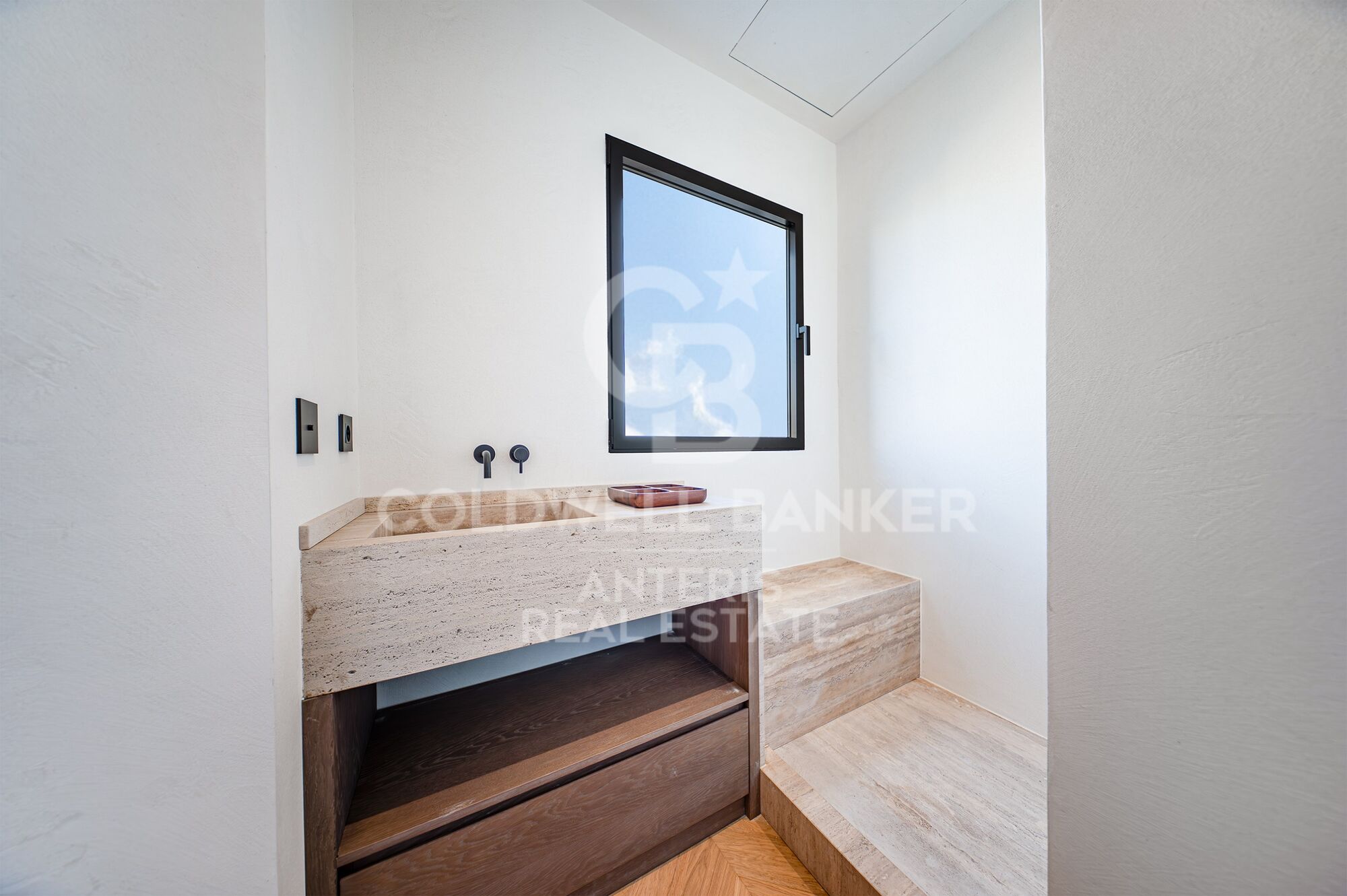 On the other hand, the terrace floor is finished in Travertino Vallanca, a prestigious natural stone. The sink and shower wall in the main bedroom's bathroom are made of Arabescato marble, a natural stone known for its strong character and striking appearance.