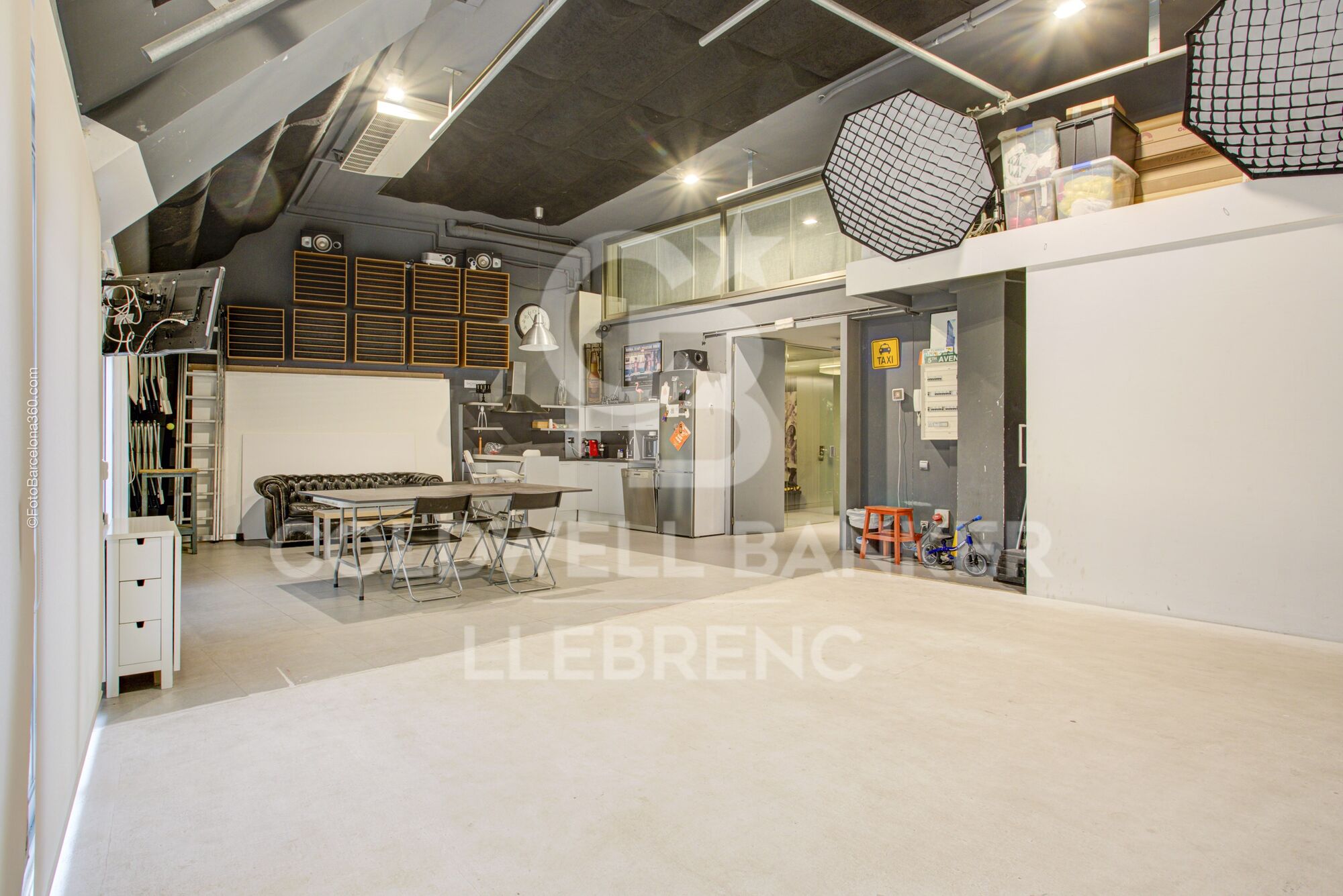 On the -1 level, there is a room adapted as a recording studio, two working spaces with an interior terrace, a restroom, and a small reception area.