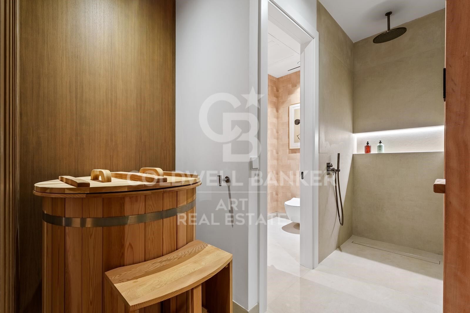 Die obere Ebene beherbergt die Hauptsuite mit privater Terrasse, begehbarem Kleiderschrank und luxuriösem Badezimmer, sowie zusätzliche Gästesuiten, die mit Komfort und Stil gestaltet wurden.