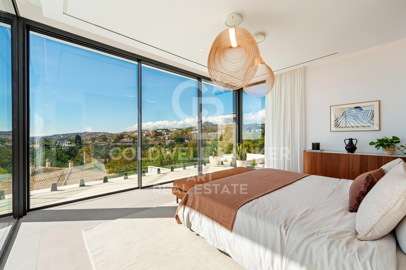 Prächtige zeitgenössische Residenz, gelegen im privaten Enklave in La Quinta, Marbella. Erschaffen von Cogitari Homes, spiegelt sie die perfekte Harmonie zwischen anspruchsvollem architektonischem Design und der ruhigen natürlichen Schönheit ihrer Umgebung wider. Zwischen dem Mittelmeer und dem Berg La Concha gelegen, bietet diese exklusive Villa einen Panoramablick über das Golfvalley und die Küste und garantiert gleichzeitig absolute Privatsphäre und Ruhe.