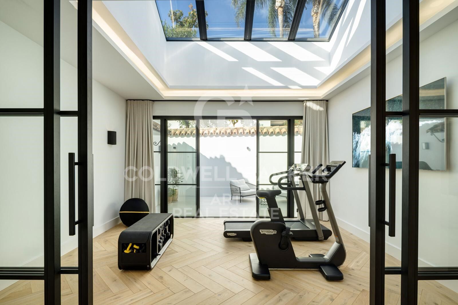 Weitere Highlights: Technogym-Fitnessraum mit elektrischem Glasdach, Garage mit E-Ladestation und modernes Sicherheitssystem mit Target-Kameras, 24-Stunden-Überwachung und Zugangskontrolle.