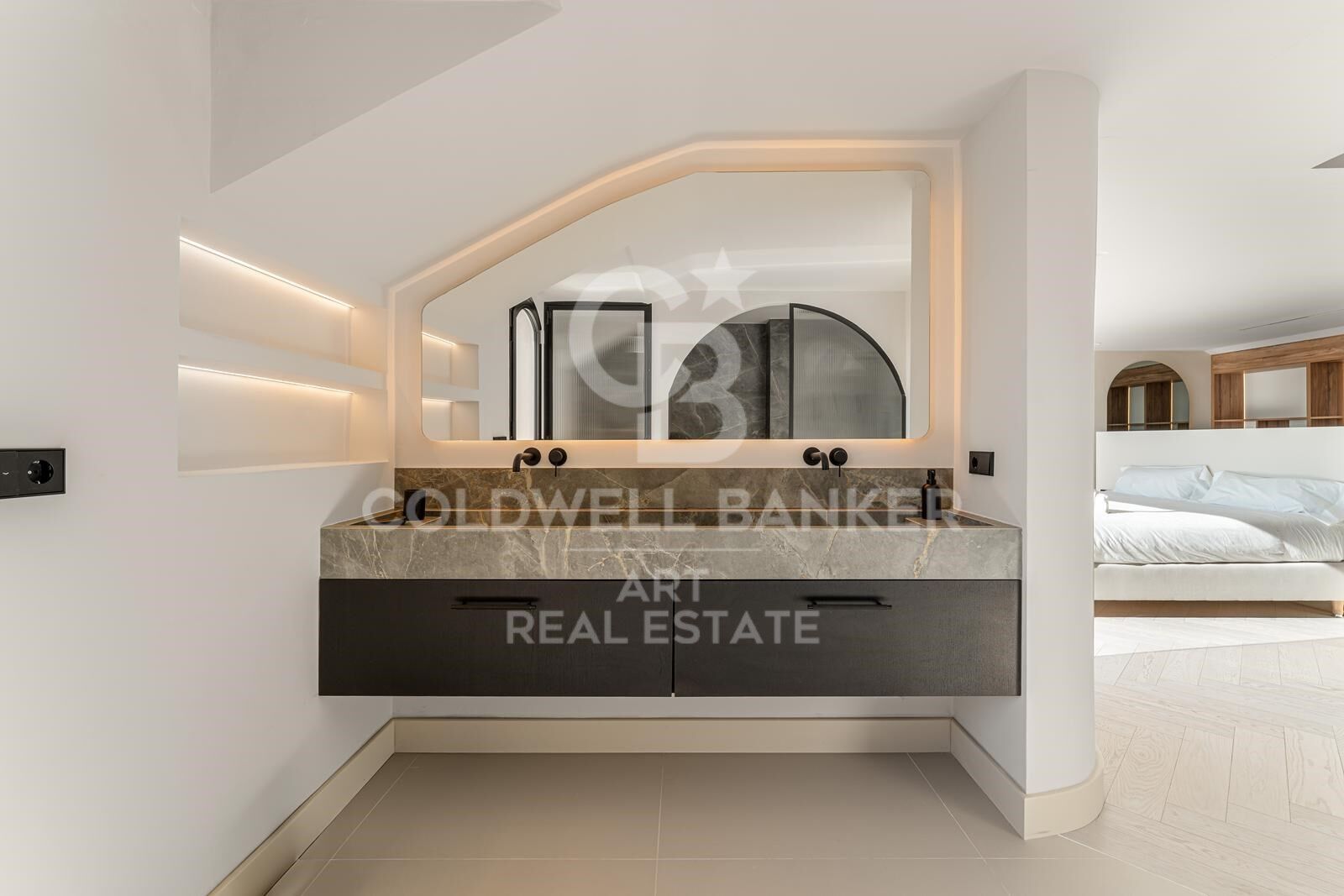 Auf zwei Ebenen verteilt, bietet das Penthouse vier Schlafzimmer (eines als Büro genutzt), drei Badezimmer und ein Gäste-WC. Die obere Etage ist der luxuriösen Master-Suite mit privater Terrasse und Whirlpool gewidmet.