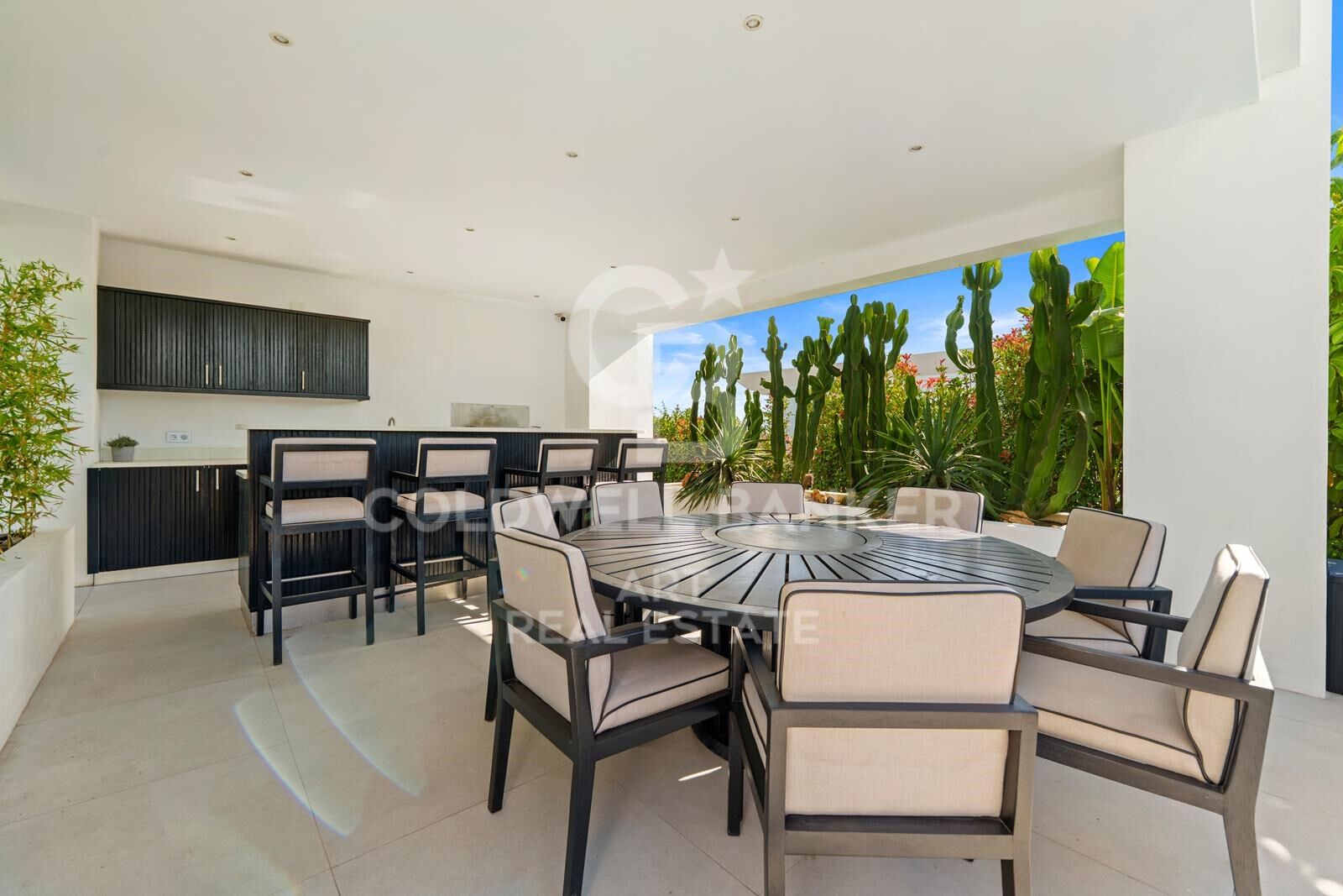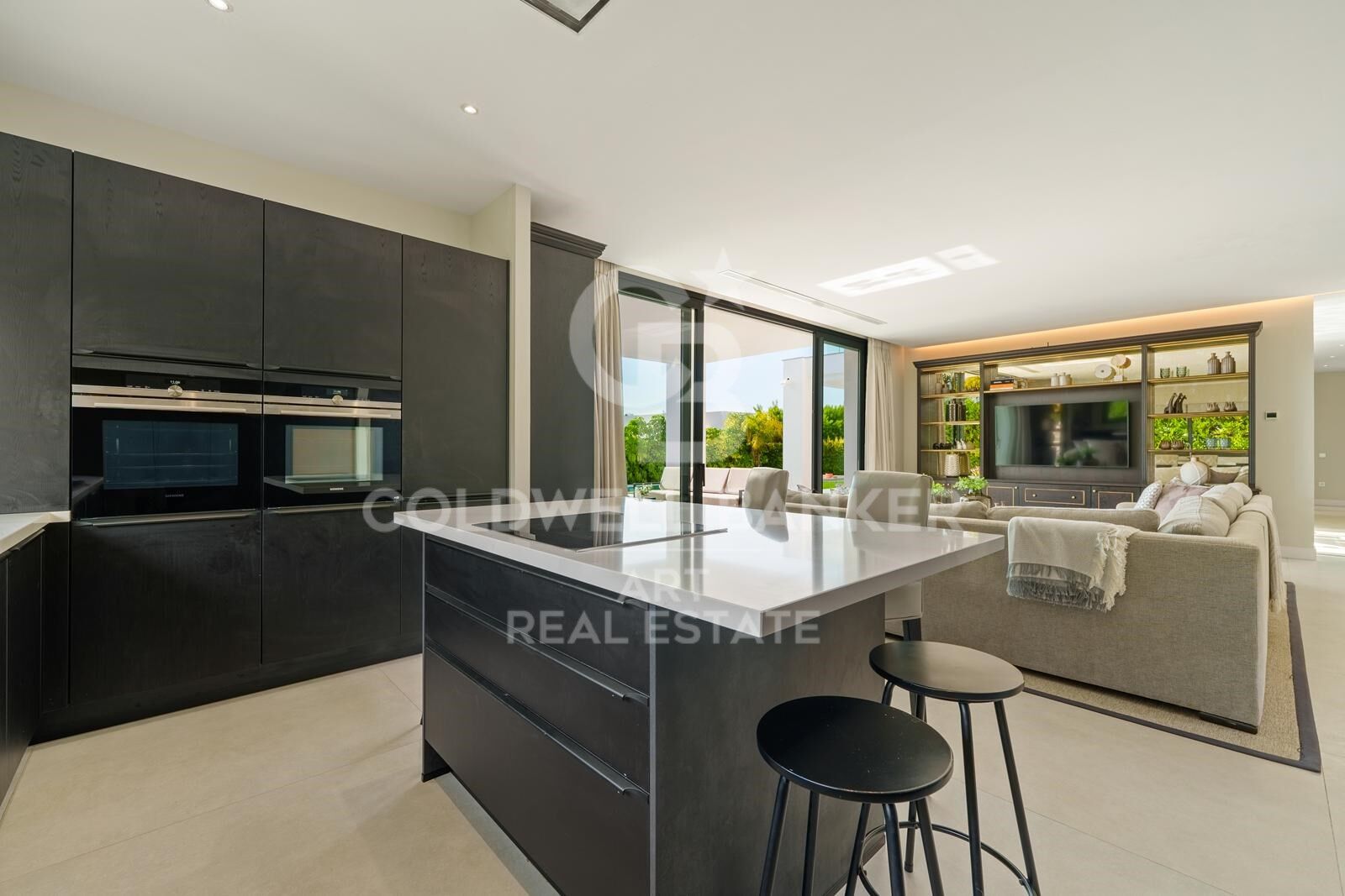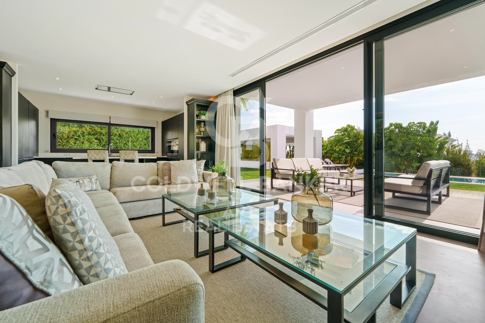 Zeitgenössische Residenz, gestaltet für modernes und elegantes Wohnen, mit einem großzügigen, offenen Grundriss, der Wohnzimmer, Essbereich und voll ausgestattete Küche integriert und sich über bodentiefe Fenster nahtlos mit dem Außenbereich verbindet.
