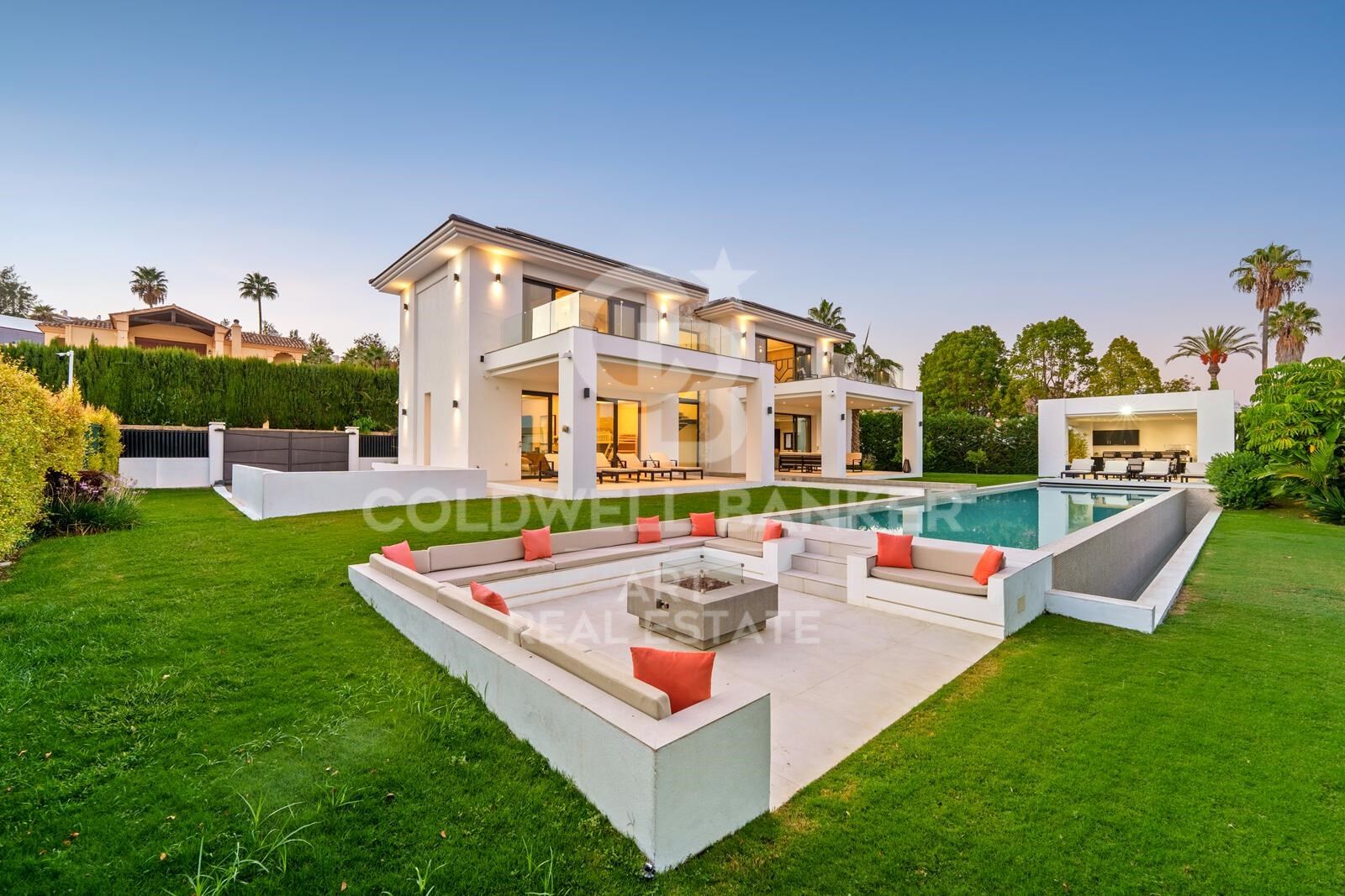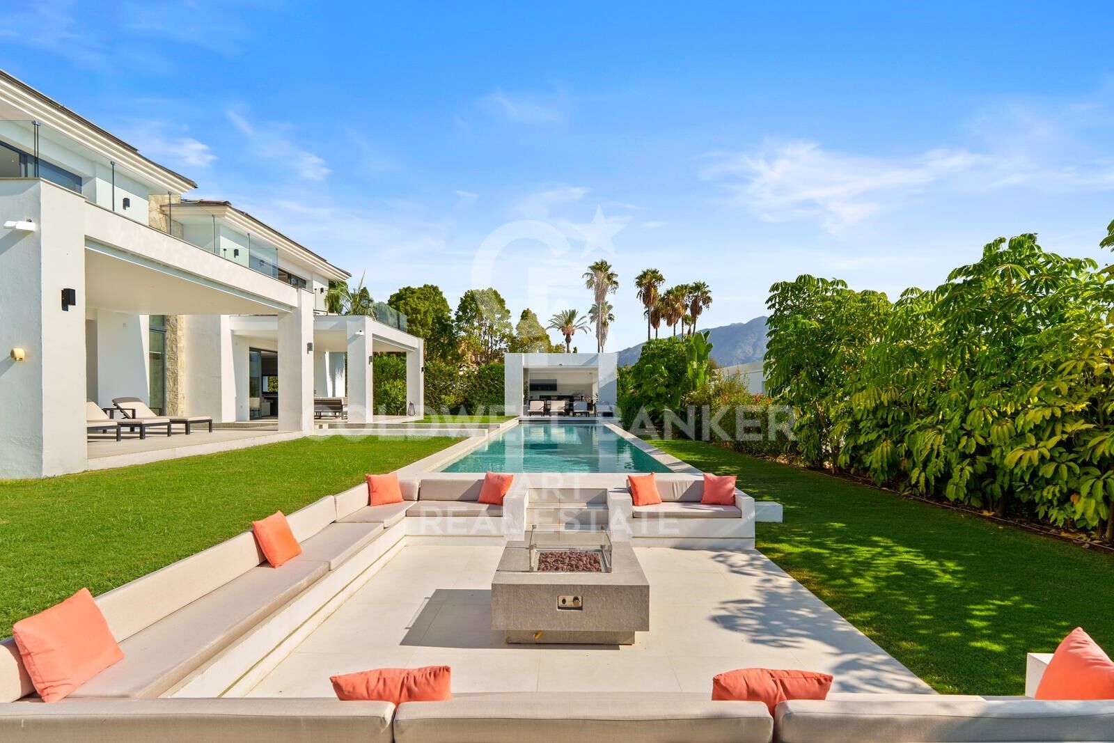 Der Außenbereich umfasst einen großzügigen Pool mit Sonnenterrassen, einen Lounge-Bereich am Pool mit Kamin und mehrere überdachte Sitzbereiche. Die Außenküche und der Essbereich bieten den idealen Rahmen für Zusammenkünfte und Unterhaltung.