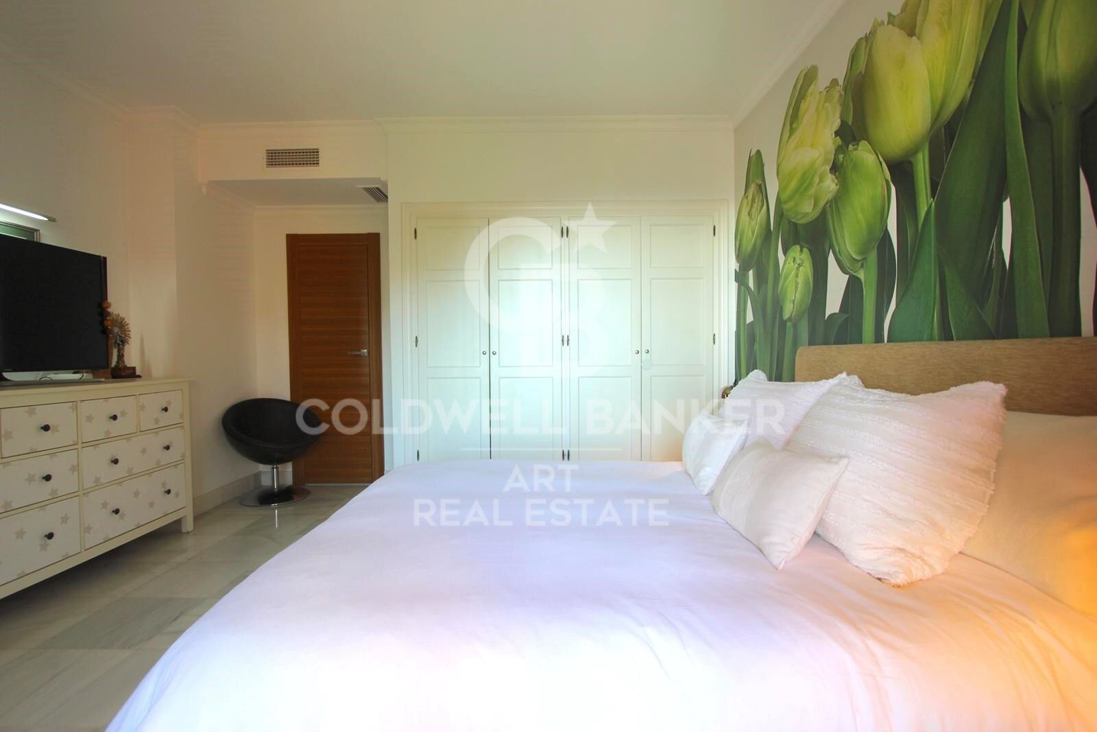 Das Penthouse ist nach Südosten ausgerichtet und bietet offene Panoramablicke auf das Meer und die Golfplätze. Ein Aufzug verbindet zwei private Parkplätze direkt mit dem Eingang. Im Inneren führt eine große Diele zu einem Zimmer, das derzeit als Büro genutzt wird (oder leicht in ein Schlafzimmer umgewandelt werden kann). Das Wohnzimmer ist hell und großzügig, unterteilt in Essbereich, Lounge mit Kamin und einen gemütlichen Leseecke. Außerdem gibt es einen Abstellraum, ein Badezimmer und einen Holzlagerraum unter der Treppe.