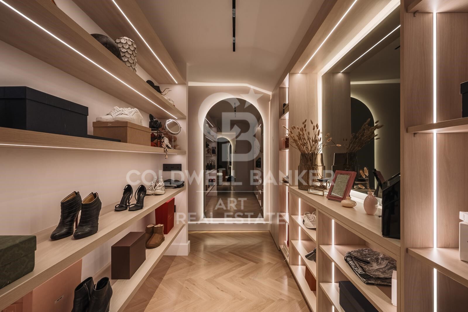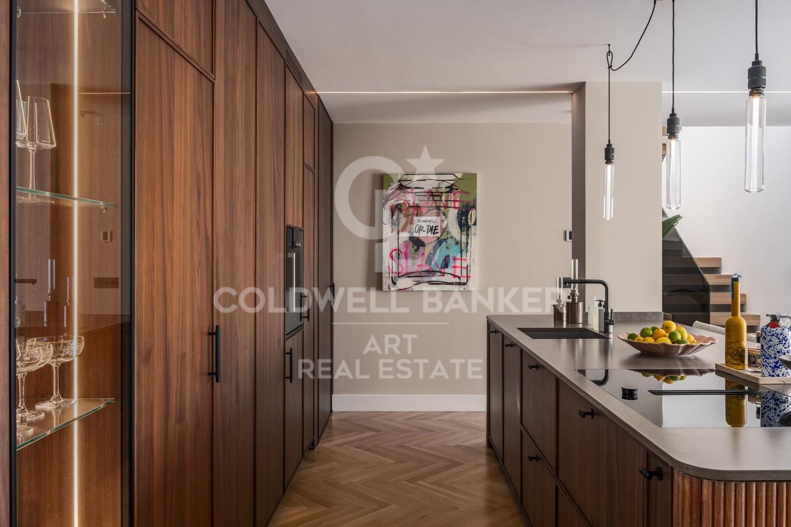 Die Küche mit nordischem Design in natürlichem Nussbaum ist mit Gaggenau- und Smeg-Geräten ausgestattet und in das Wohn-Esszimmer integriert, ideal sowohl für informelle Meetings als auch für elegante Abendessen. Alle Tischlerarbeiten wurden nach Maß gefertigt, um eine einheitliche und raffinierte Ästhetik zu gewährleisten.
