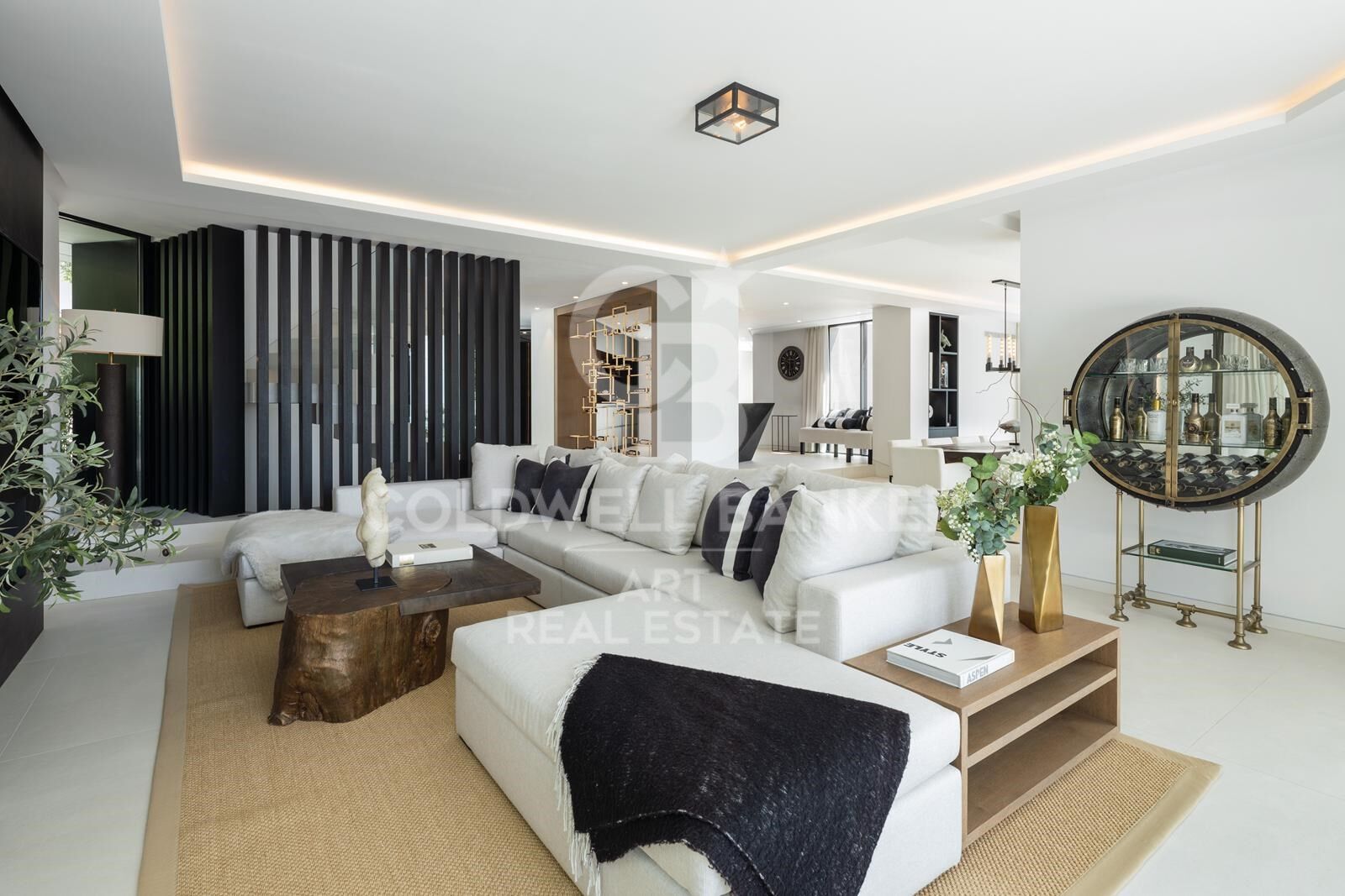 Ursprünglich entworfen vom renommierten Architekten Antonio Morillo von AMES Architects und 2020 von Palmeras vollständig renoviert, spiegelt dieses außergewöhnliche Anwesen Spitzen-Design und Qualität wider. Das Anwesen liegt auf einem großzügigen Grundstück von 1.941 m² und erstreckt sich über drei Ebenen mit 555 m² Wohnfläche und 530 m² Terrassen, die ein nahtloses Innen-Außen-Leben ermöglichen.
