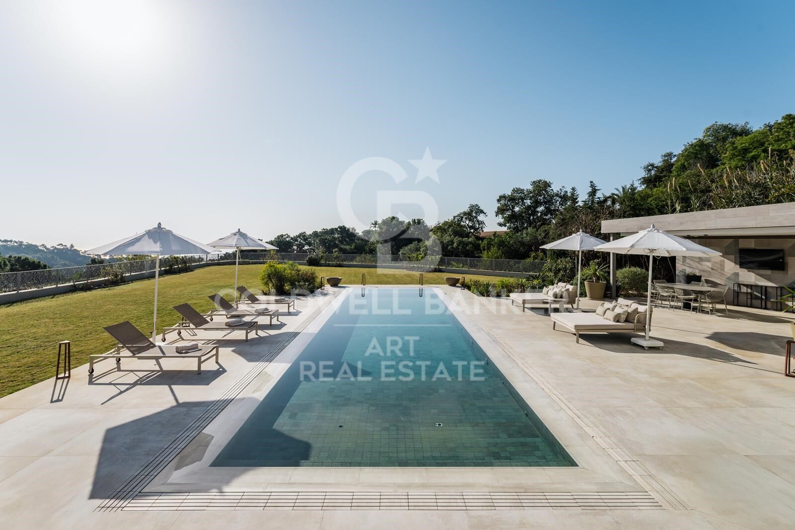 Bodentiefe Fenster öffnen sich zur großzügigen Terrasse mit schön angelegten Gärten und gepflegtem Rasen. Der Außenbereich ist ideal für geselliges Beisammensein mit einer voll ausgestatteten Sommerküche, einem Essbereich im Freien mit Grill und einem einladenden Swimmingpool.