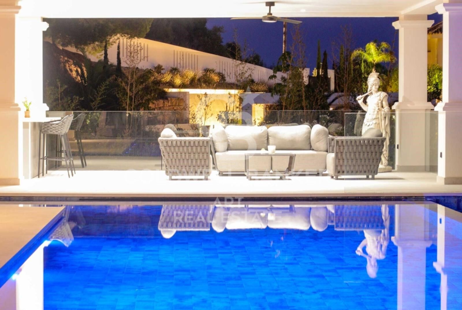 Die großzügigen, lichtdurchfluteten Wohnräume sind elegant gestaltet, mit Marmorfußböden und bodentiefen Fenstern, die das Innen- und Außenleben nahtlos verbinden. Zeitgemäßes Interieur und stilvolle Möbel sorgen für eine warme und einladende Atmosphäre.
