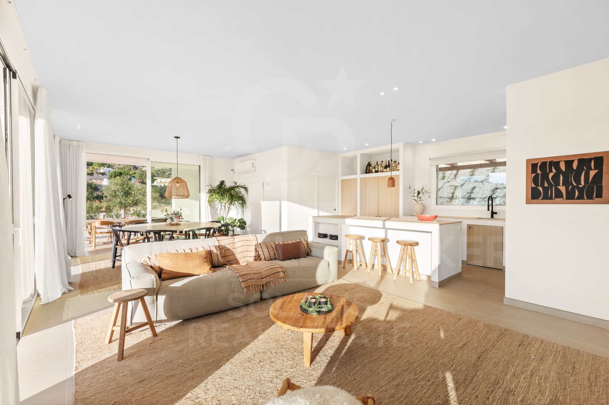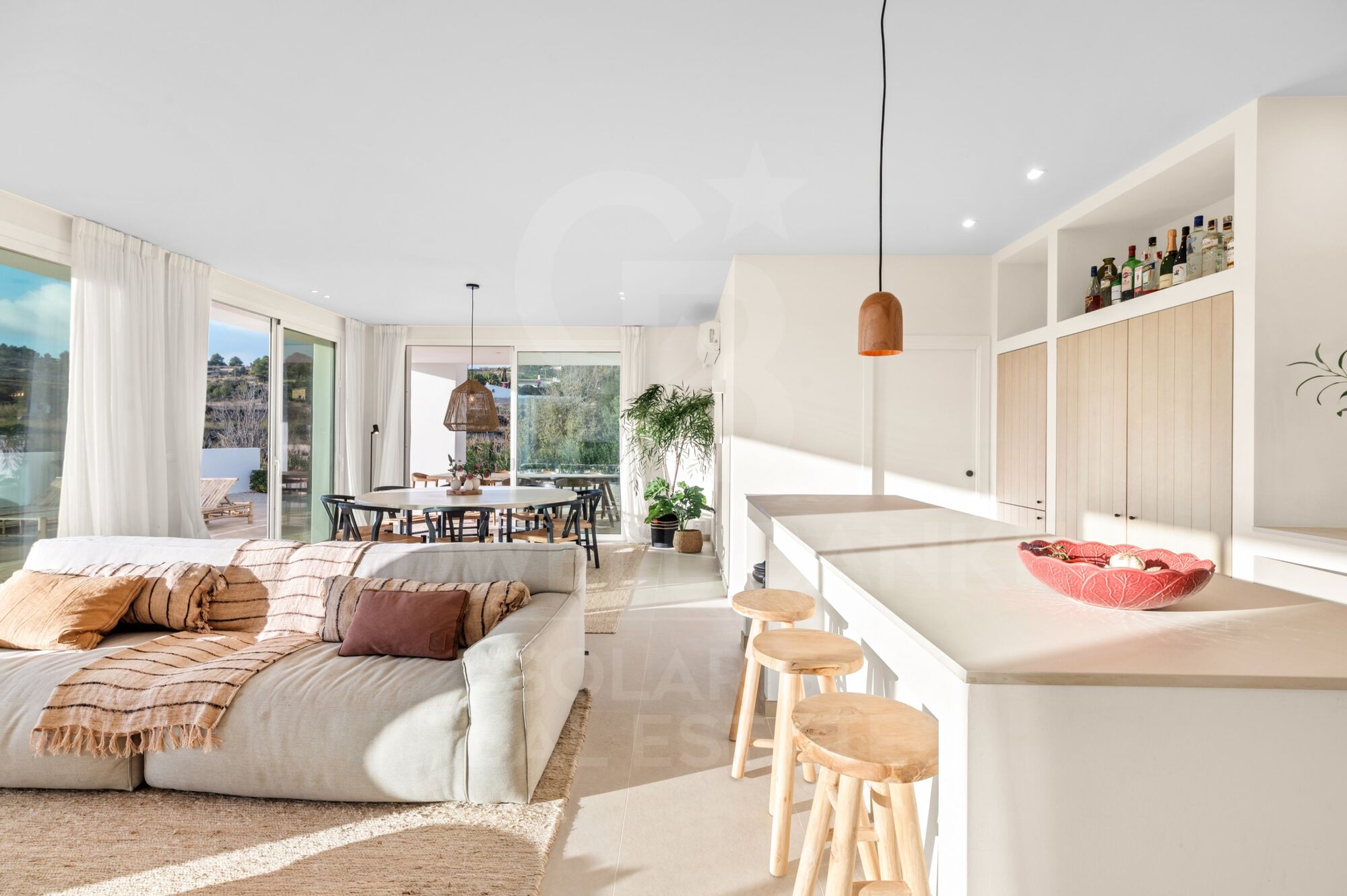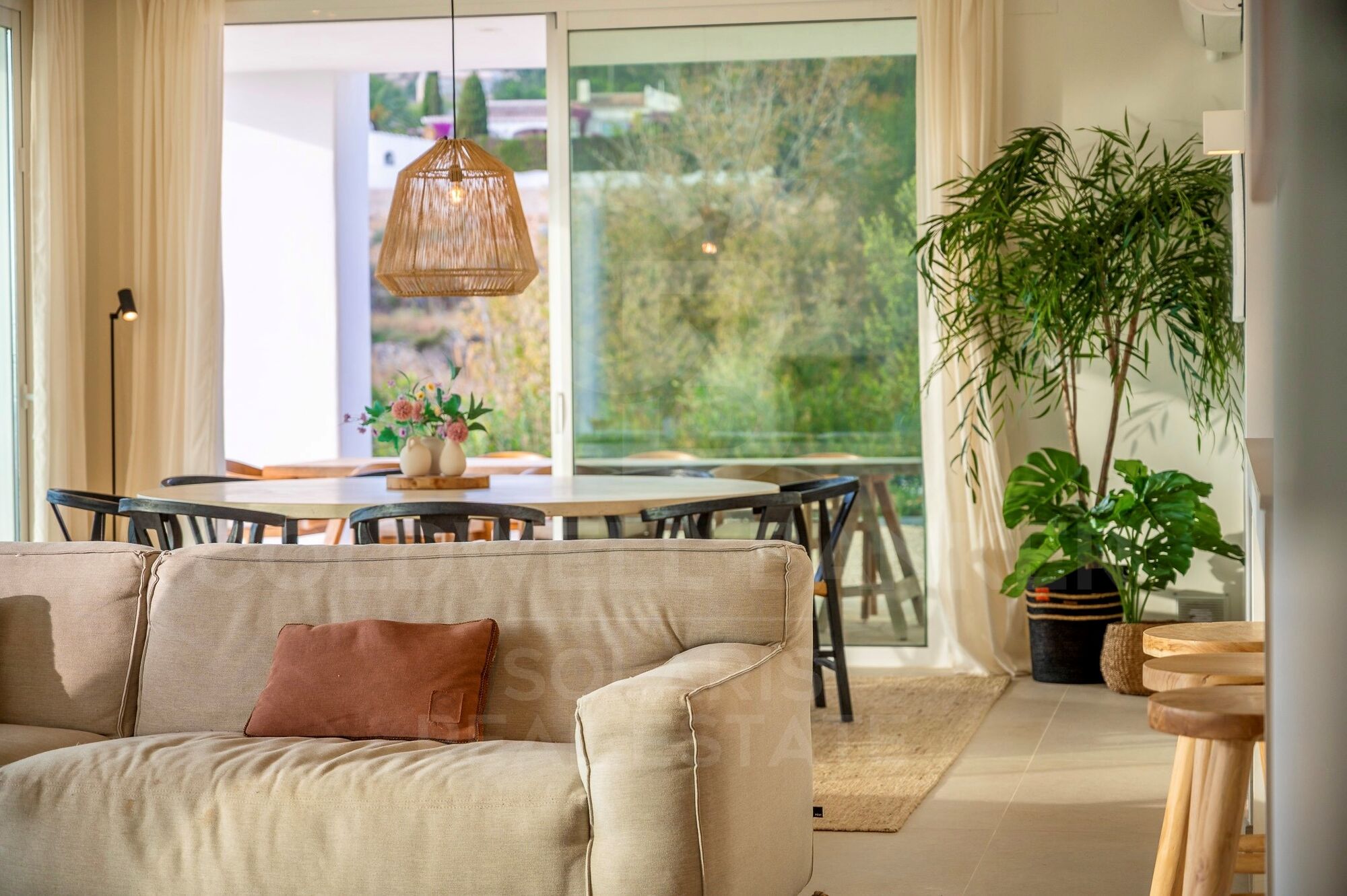 Das Haus verfügt über sechs Schlafzimmer, drei Badezimmer, eine Gästetoilette im Inneren und eine separate Außentoilette, die eine funktionale und komfortable Verteilung sowohl für die Familiennutzung als auch für den Empfang von Gästen bietet. Das großzügige, offene Wohn- und Esszimmer, das Wohn-, Ess- und Küchenbereiche integriert, verbindet sich natürlich mit den Terrassen und dem 33 m² großen Schwimmbad und schafft so eine perfekte Kontinuität zwischen Innen- und Außenbereichen.