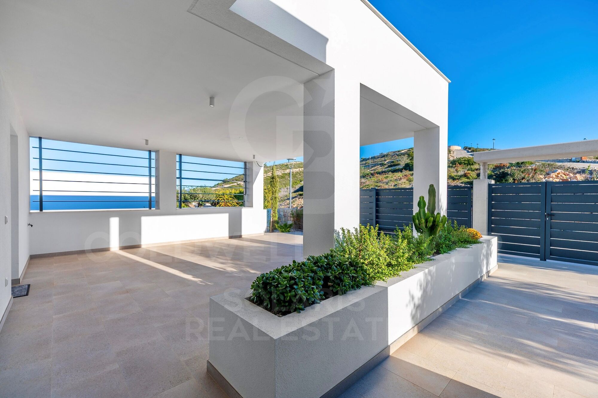 Die Außenbereiche wurden so konzipiert, dass sie den mediterranen Lebensstil voll und ganz genießen. Geräumige Terrassen, ein gepflegter privater Garten, ein beheiztes Schwimmbecken und ein eleganter Grillbereich schaffen die ideale Atmosphäre für Entspannung und Unterhaltung. Von praktisch jedem Punkt der Villa aus kann man spektakuläre offene Ausblicke aufs Meer genießen, die ein unvergleichliches Gefühl von Privatsphäre, Ruhe und Exklusivität bieten.