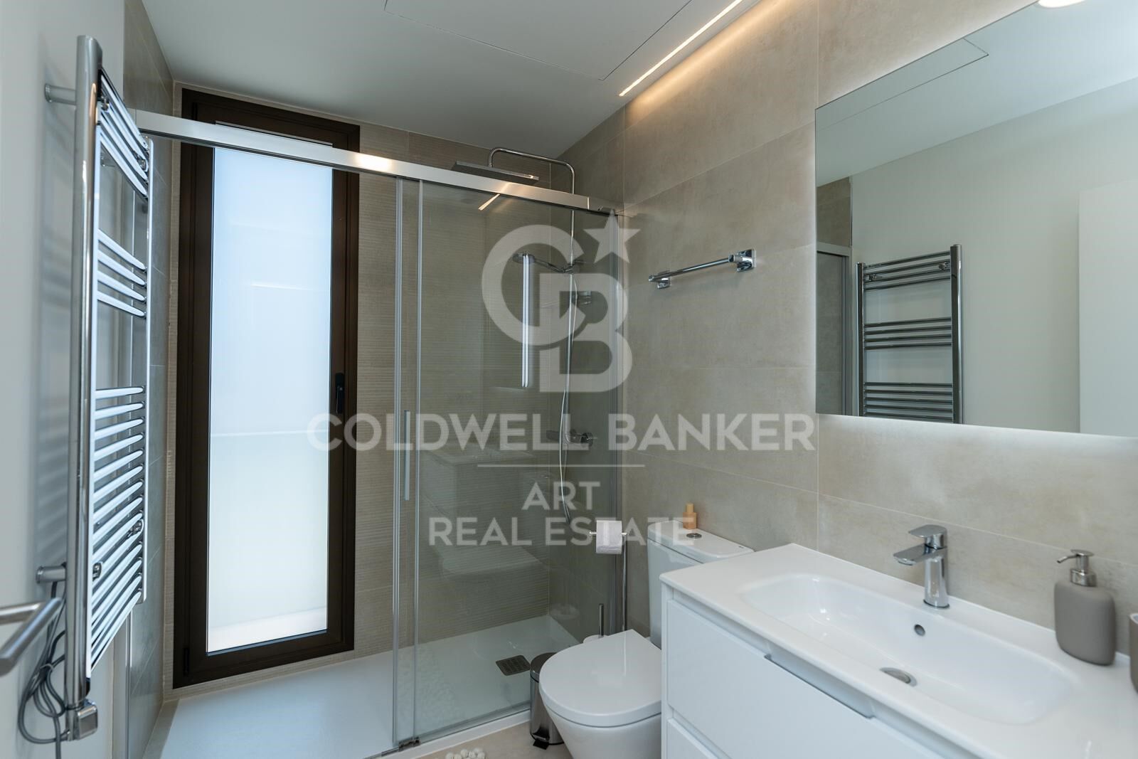 Das Hauptschlafzimmer verfügt über ein eigenes Bad, große Einbauschränke und direkten Zugang zur Terrasse. Die beiden weiteren Schlafzimmer teilen sich ein modernes Bad und bieten ebenfalls Einbauschränke. Zur Ausstattung gehören Klimaanlage (warm/kalt) und elektrische Rollläden. Im Preis inbegriffen sind ein Stellplatz in der Tiefgarage sowie ein Abstellraum.