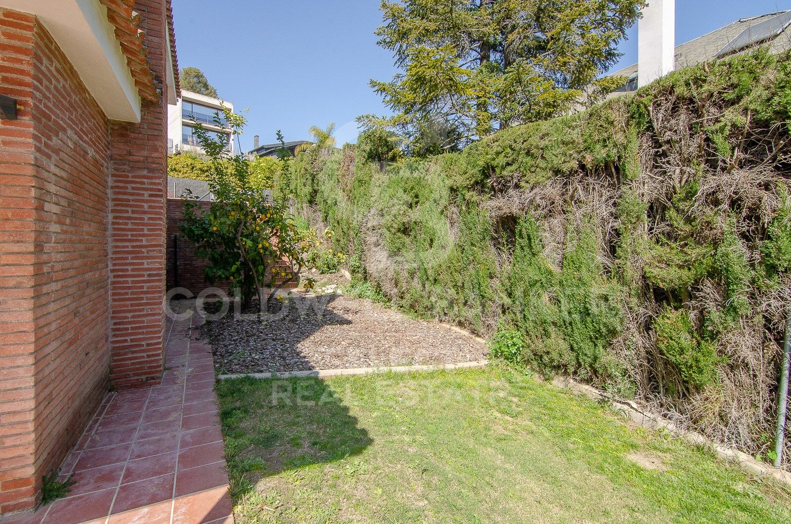 Upon entering the property, which is entirely made of exposed brick on the exterior, we are pleasantly surprised by the landscaping that welcomes us; it is original, Mediterranean, and sustainable. The house is spread over two half floors, sufficient to overcome the unevenness of the plot. The interior access from the garage to the house also coincides directly at the entrance. On the lower floor, at the foot of the garden and pool, we find the wonderful living-dining room with a fireplace, filled with light through a large window and sliding doors that give direct access to the garden. The view of the green lawn that reaches down to the pool is very refreshing and invites us to step out into the garden. Right there, we have a large covered terrace where we can enjoy lunch and dinner al fresco, while still overlooking the enormous pool. There is enough space to accommodate a chill-out area to relax and enjoy conversations with family and friends. Finally, there is a beautiful barbecue well integrated into the building. Connected to the living room and with direct access to it, we find the functional and spacious kitchen, large enough to accommodate a breakfast area. From the kitchen, we access the utility and boiler area, which has its own exit to the west side of the house. On the same floor, there is a room that can be used as an office or bedroom, served by a bathroom with a shower.