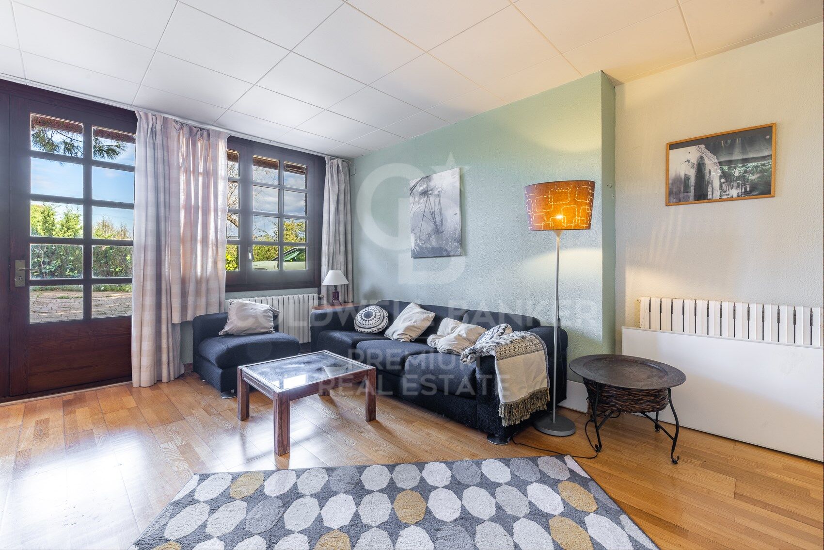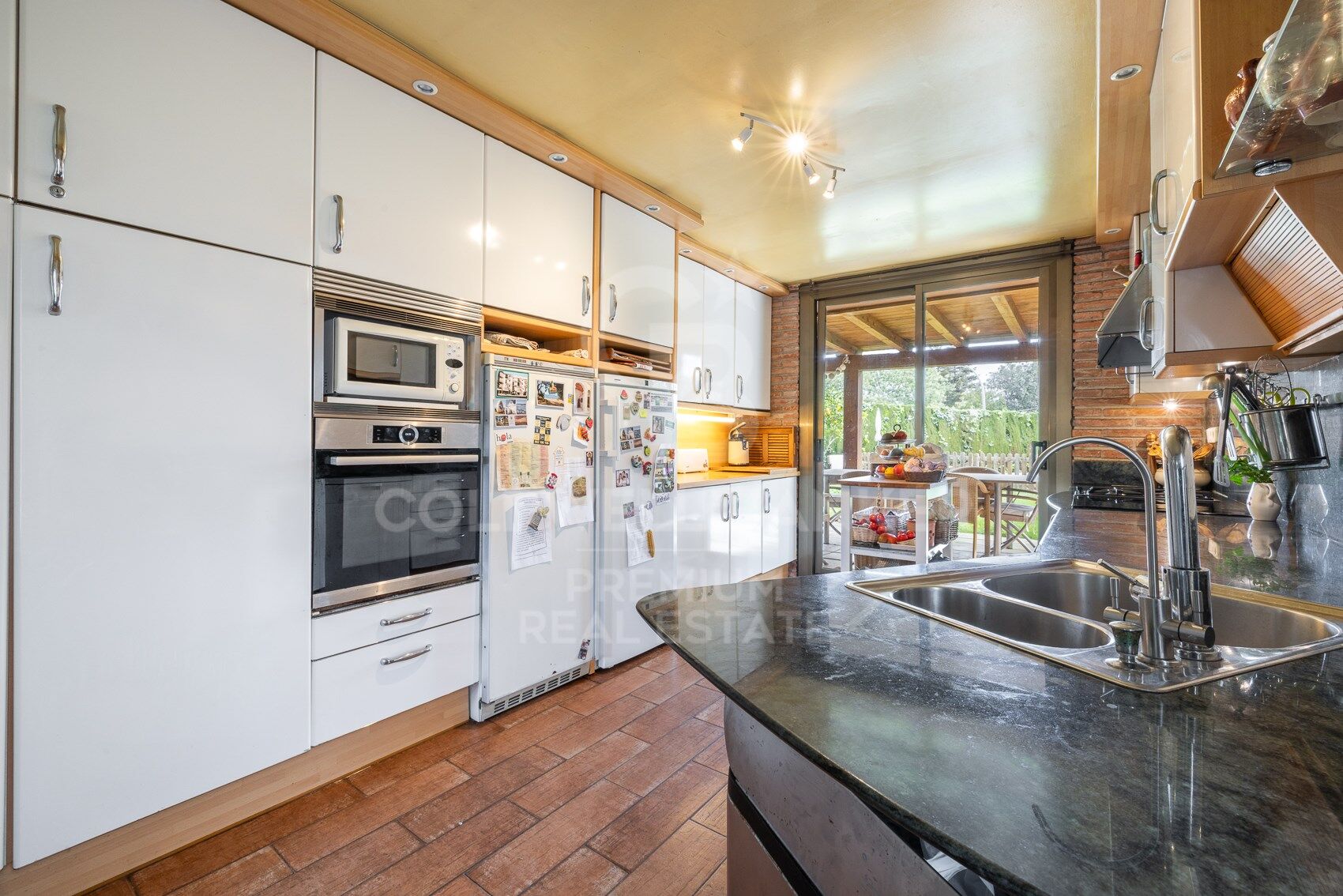 Ein einladender Eingangsbereich führt uns in das gemütliche Wohnzimmer mit Kamin. Der gleiche große Raum beherbergt das Esszimmer. Das Wohnzimmer ist auch mit der Küche verbunden und hat wie diese direkten Zugang zum Garten durch große Schiebetüren. Hinter diesen Türen befindet sich eine praktische Terrasse für Mahlzeiten im Freien. Der Küchenbereich wird mit einem charmanten Büroraum ergänzt, das mit einem hellen Fenster für Frühstücke und tägliche Mahlzeiten ausgestattet ist. Vom Wohnzimmer aus kann man auch ein großartiges Büro mit spektakulärem Blick auf La Mola und Montseny betreten. Zurück im Eingangsbereich führen uns die Treppen zu den anderen Etagen. Ebenfalls auf dieser Etage befindet sich das Hauptschlafzimmer mit begehbarem Kleiderschrank und eigenem Badezimmer.