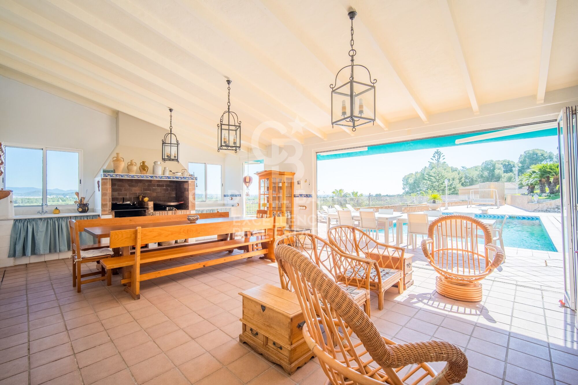 - Wohn- und Esszimmer mit 90 m², direkter Zugang zur Terrasse und Blick auf den Pool