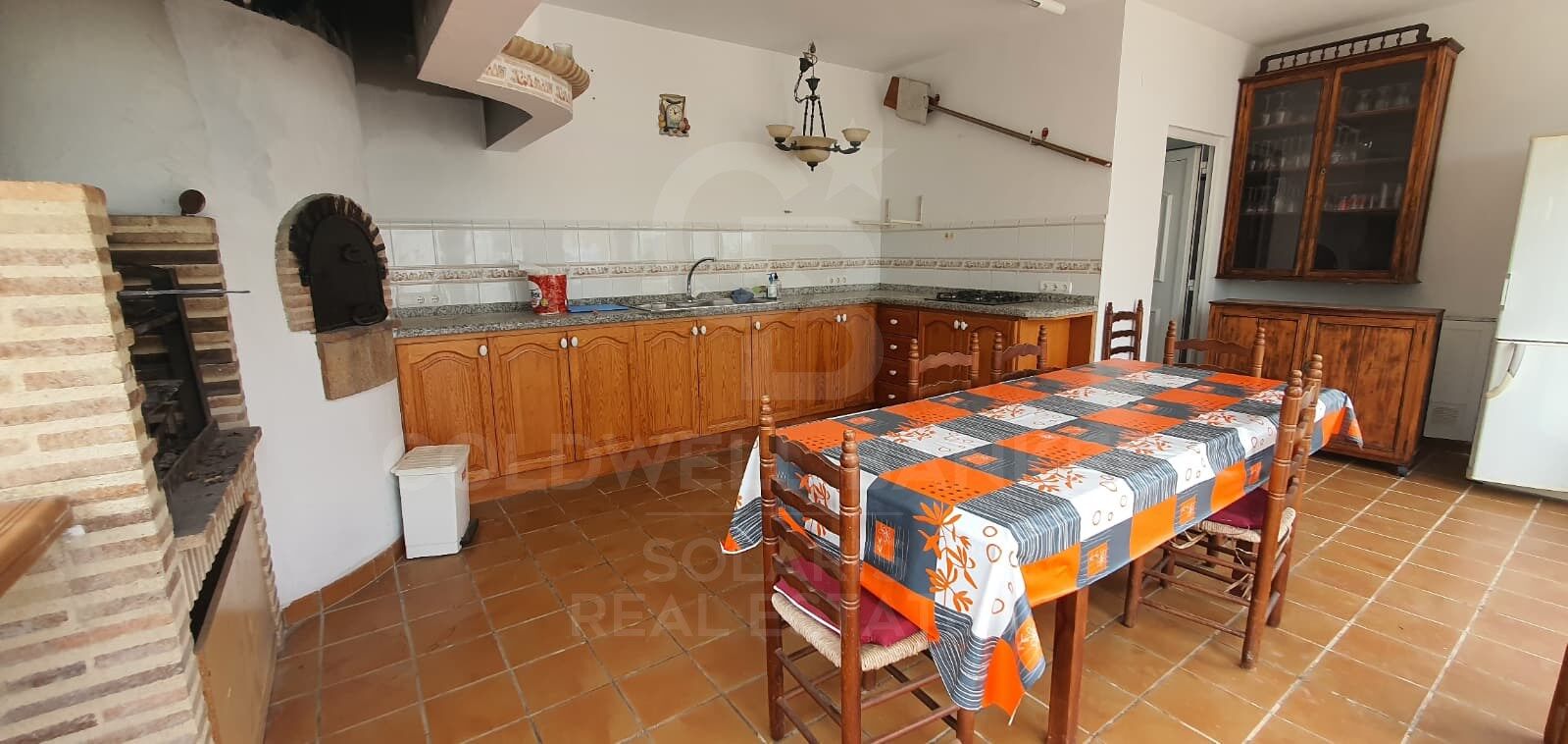 Zona de barbacoa totalmente equipada con horno de leña, paellero, nevera, cocina, comedor, baño y cerramiento para invierno
