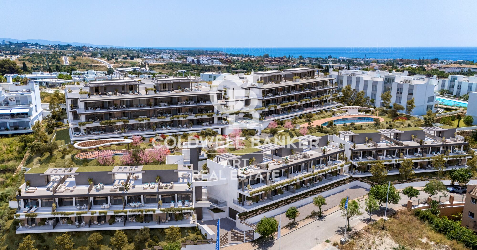 Die Wohnungen zeichnen sich durch ihre offenen Innenräume mit großen Fenstern aus, die die Räume mit Tageslicht durchfluten und sich zu den nach Südwesten ausgerichteten Terrassen hin öffnen. Die hochwertigen Ausstattungen und der Blick auf das Mittelmeer und die Sierra Bermeja schaffen eine elegante und gemütliche Atmosphäre.