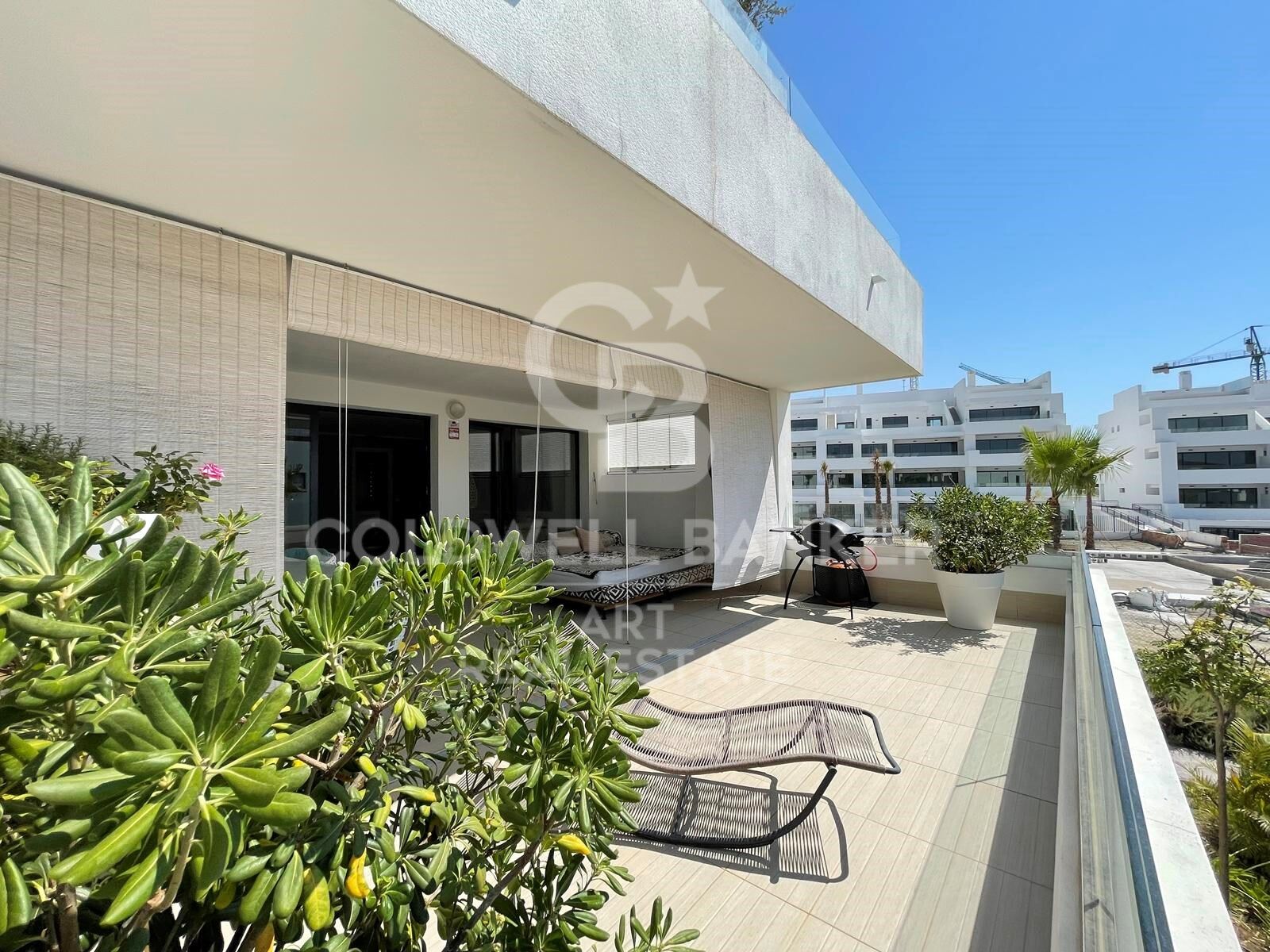 Die Wohnung verfügt über zwei Schlafzimmer und zwei Badezimmer und ist damit ideal für Familien und Paare, die Wert auf Platz und Funktionalität legen. Es verfügt über eine private Terrasse von 45 m² und einen Patio im Erdgeschoss von weiteren 45 m², perfekt, um die Sonne, das mediterrane Klima und den angenehmen Teilblick auf das Meer zu genießen.
