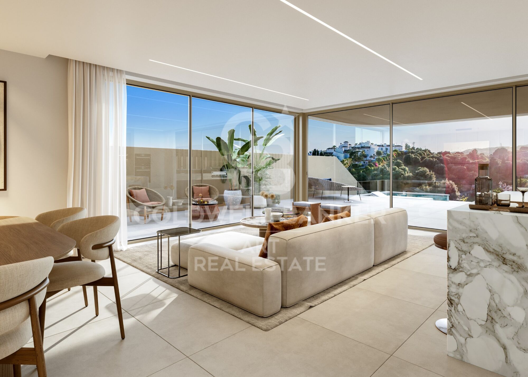 Die Hauptterrasse, die an den Wohn-Ess-Küchenbereich angeschlossen ist, verfügt über einen Außen-Essbereich, eine Chill-out-Zone und einen privaten Pool, wodurch ein komfortables und privates Umfeld entsteht. Im Obergeschoss bietet die Terrasse des Hauptschlafzimmers mit eigenem Bad einen Panoramablick und einen perfekten Raum, um sich in völliger Privatsphäre zu entspannen.