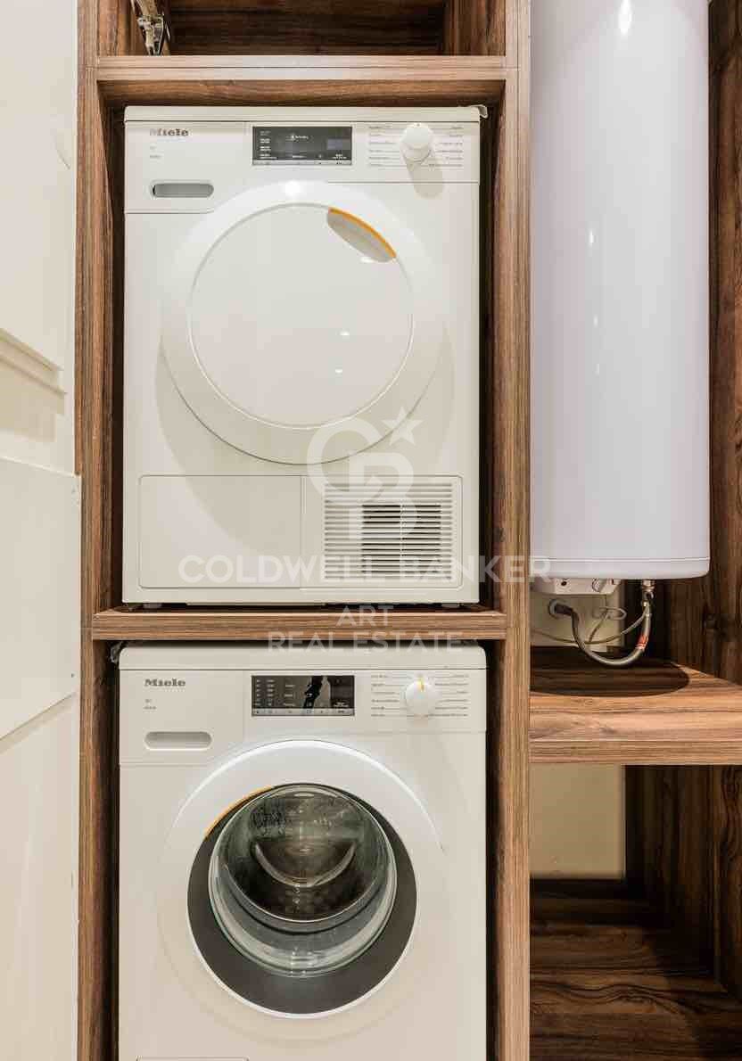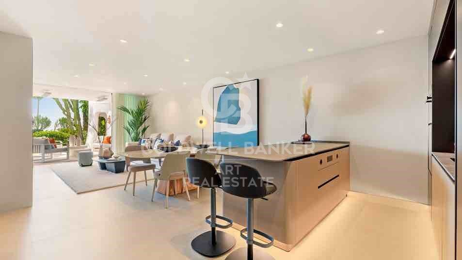 The brand new kitchen, equipped with Miele appliances, blends seamlessly with the living area, offering direct access to a spacious private terrace with stunning sea views.