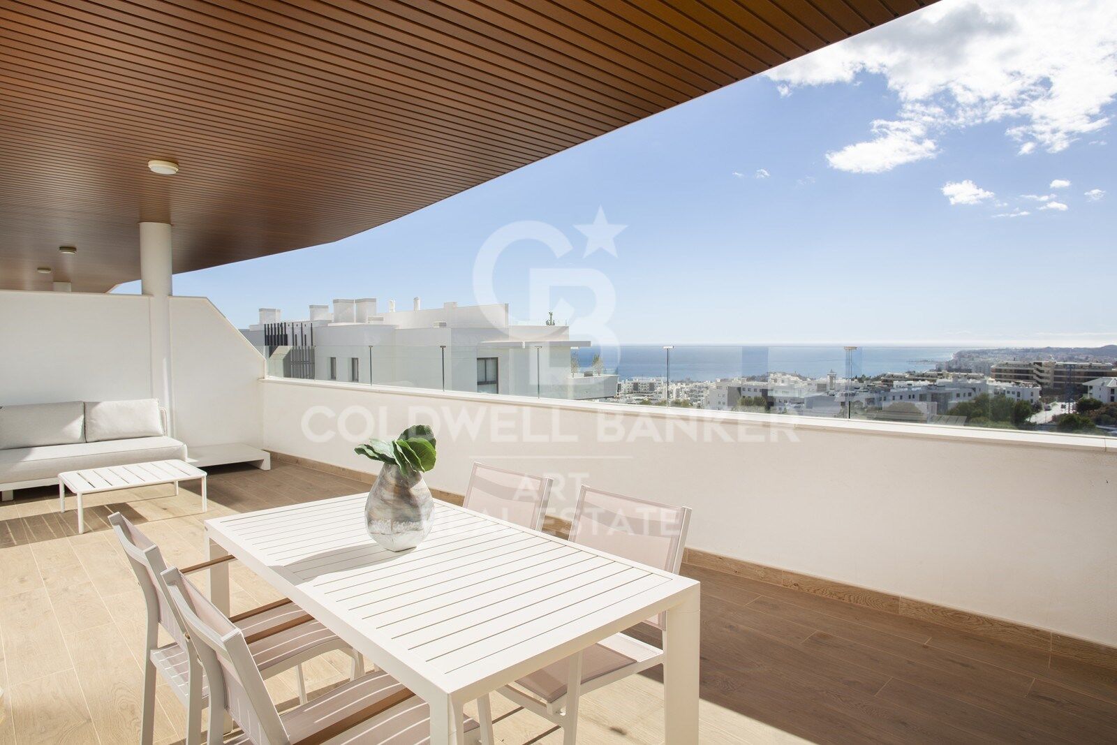 Die Wohnung verfügt über eine großzügige, voll ausgestattete offene Küche, die in das Wohnzimmer integriert ist und nach außen ausgerichtet ist, mit hervorragender Helligkeit und Meerblick. Eine große, sonnige Terrasse lädt dazu ein, das mediterrane Klima das ganze Jahr über zu genießen.