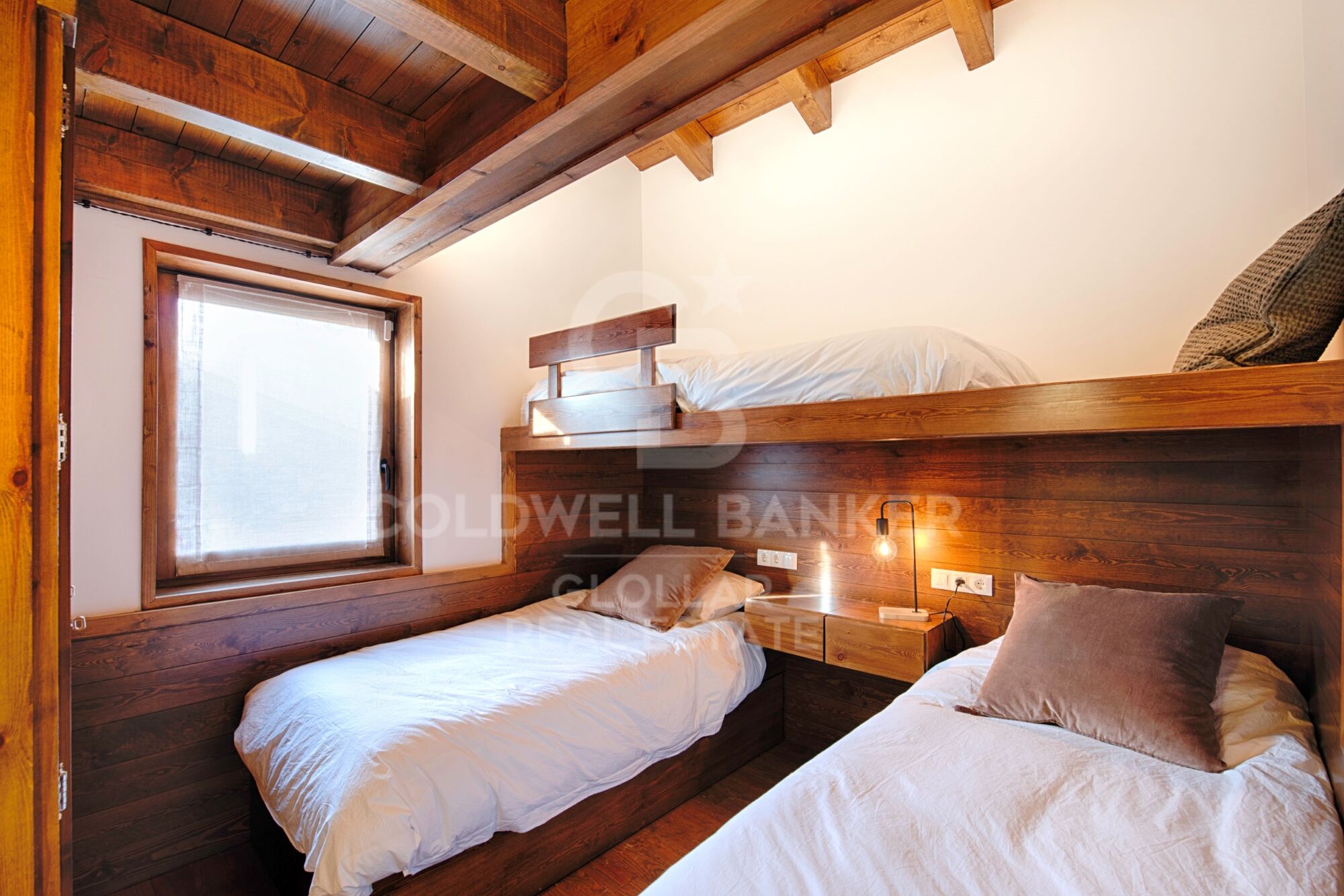 La zona de descanso se sitúa en la planta intermedia, con tres amplias habitaciones, entre ellas una suite principal, y un baño completo que da servicio al resto de dormitorios, garantizando privacidad y comodidad. La planta superior sorprende con una encantadora zona abuhardillada, presidida por techos de madera que aportan carácter y exclusividad. Un espacio versátil, ideal como despacho, sala privada o zona de relax, siempre con vistas privilegiadas al entorno natural.