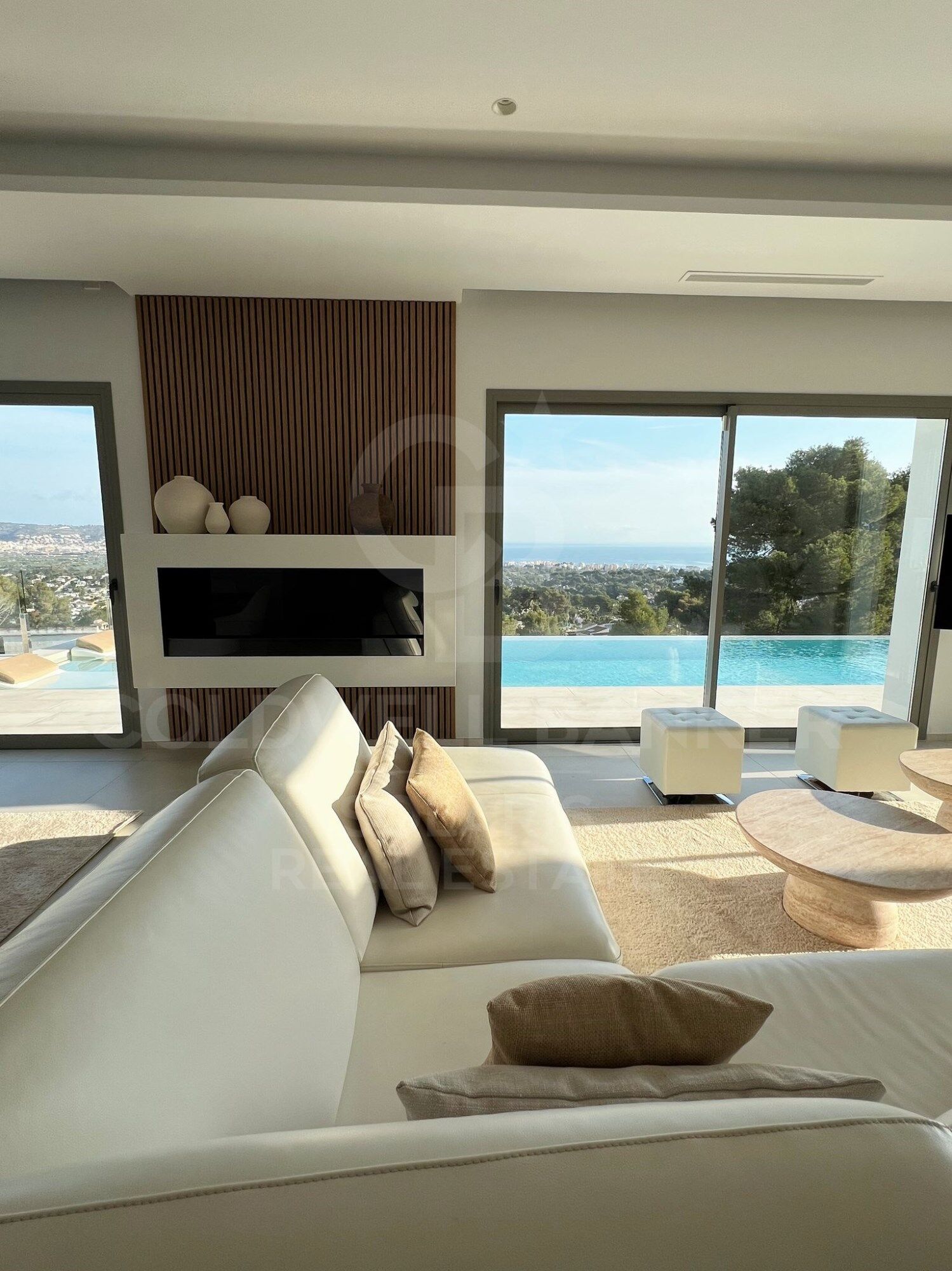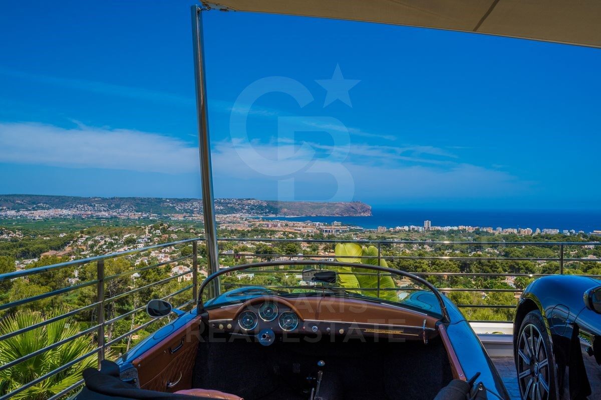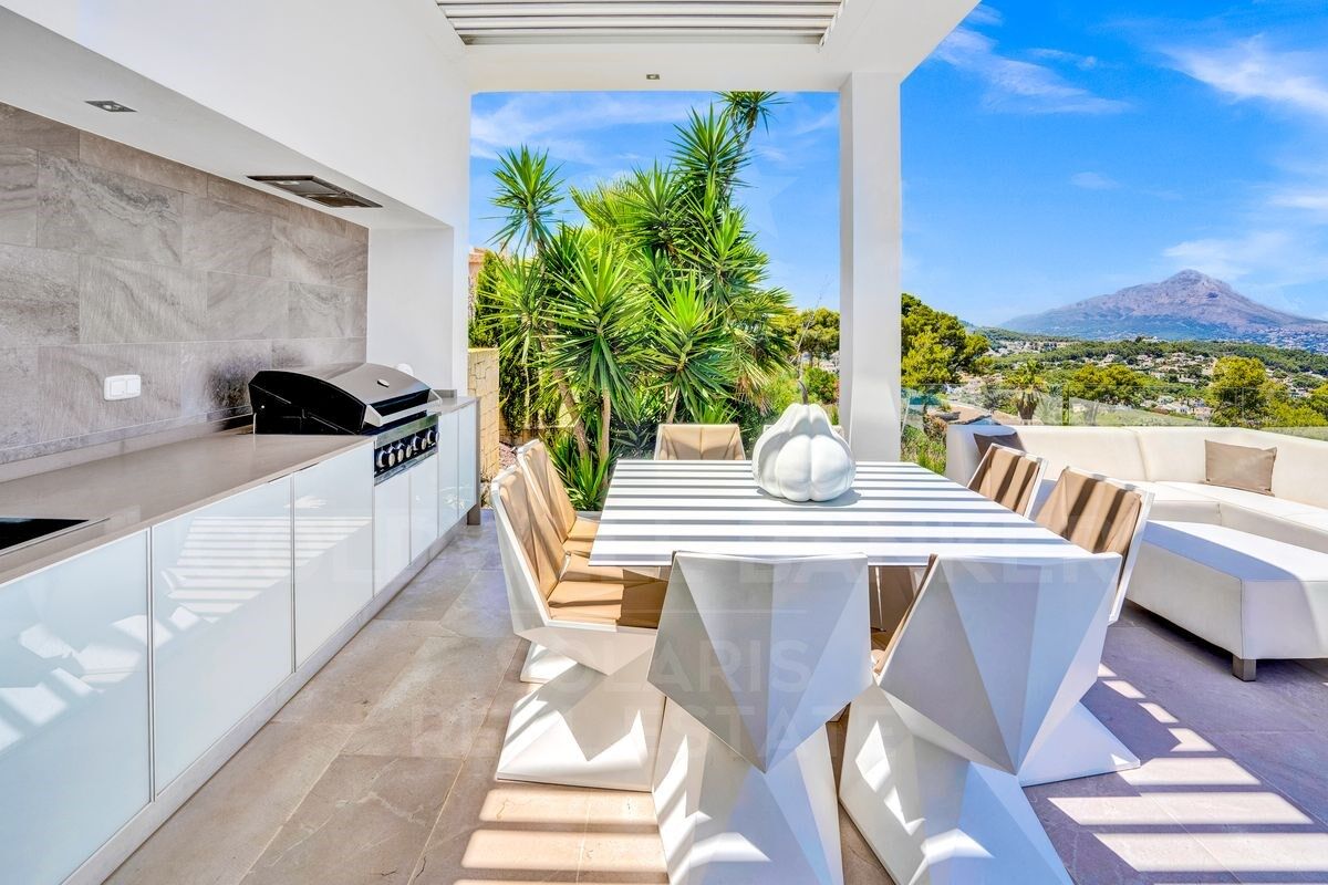 Diese atemberaubende Villa liegt nur 3 km vom Arenal entfernt und bietet den besten Panoramablick auf den Montgó und das Meer, der in Jávea zu finden ist.