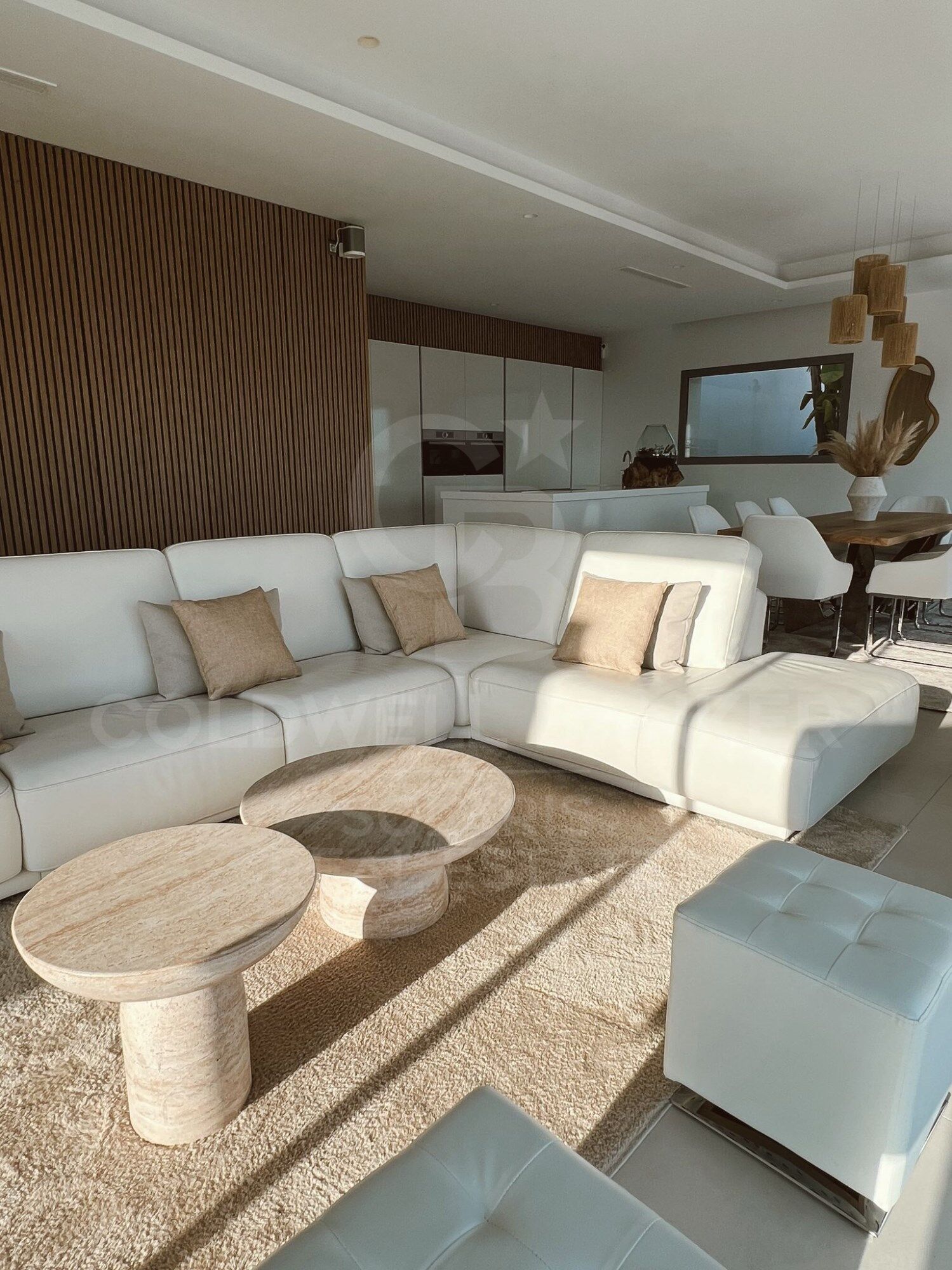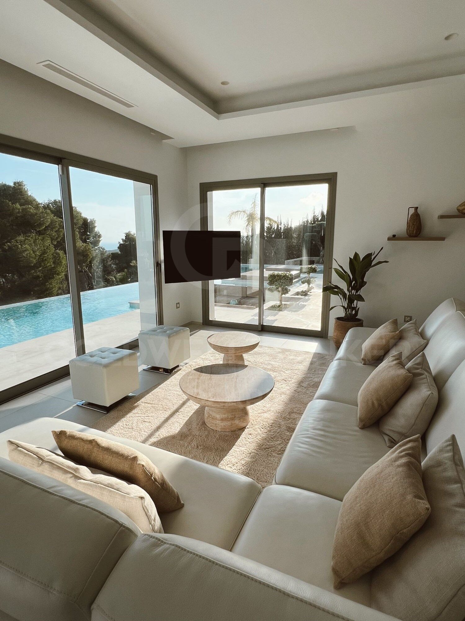 Das kürzlich erbaute Haus wurde so konzipiert, dass es aus allen Blickwinkeln einen exklusiven und einzigartigen Blick bietet, wo sich das Mittelmeer majestätisch aus dem Montgó zu erheben scheint. In der Mitte des Hauses erzeugt eine wunderbare Glassäule mit doppelter Höhe das Gefühl, auf einem Boot zu sein, so dass Sie den atemberaubenden Meerblick genießen und ein Gefühl von Urlaub und Entspannung vermitteln können. Die Aufteilung der Villa wurde sorgfältig entworfen, um das Innere des Hauses mit dem Außenbereich zu verbinden, der die ganze Bedeutung einnimmt. Eine geräumige Atmosphäre kombiniert das Wohnzimmer, das Esszimmer und die Küche mit einer Insel und öffnet sich zu einer praktischen Sommerküche mit elektrischer Pergola sowie komfortablen Terrassen, die einen idealen Raum schaffen, um den herrlichen Infinity-Pool von 23 Metern Länge zu genießen.