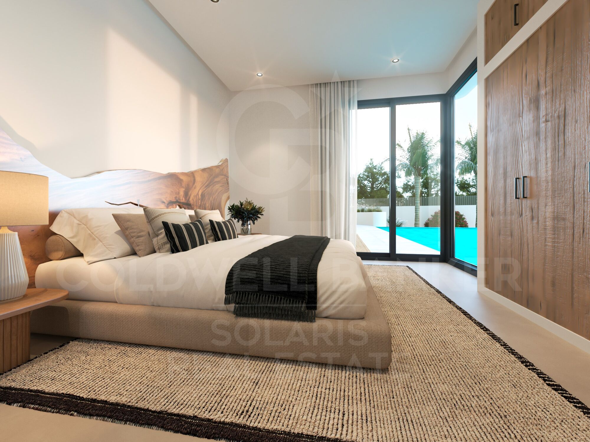 Die Aufteilung der Villa Ámbar umfasst ein geräumiges Wohn-Esszimmer und eine offene Küche mit einer einzigartigen diagonalen Insel, großen Fenstern, die außergewöhnliche Helligkeit bieten. Das Hauptschlafzimmer-Suite, das sich auf der Westseite des Hauses befindet, verfügt über ein schönes komplettes Badezimmer und einen begehbaren Kleiderschrank. Das große Fenster verbindet das Schlafzimmer direkt mit der Terrasse.