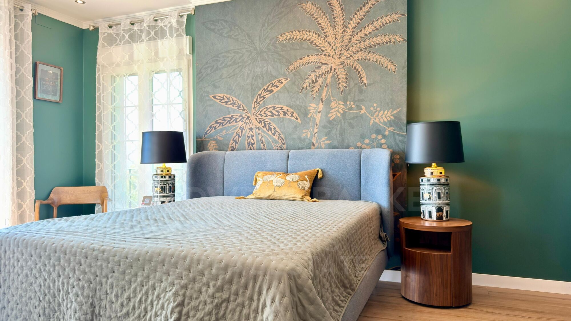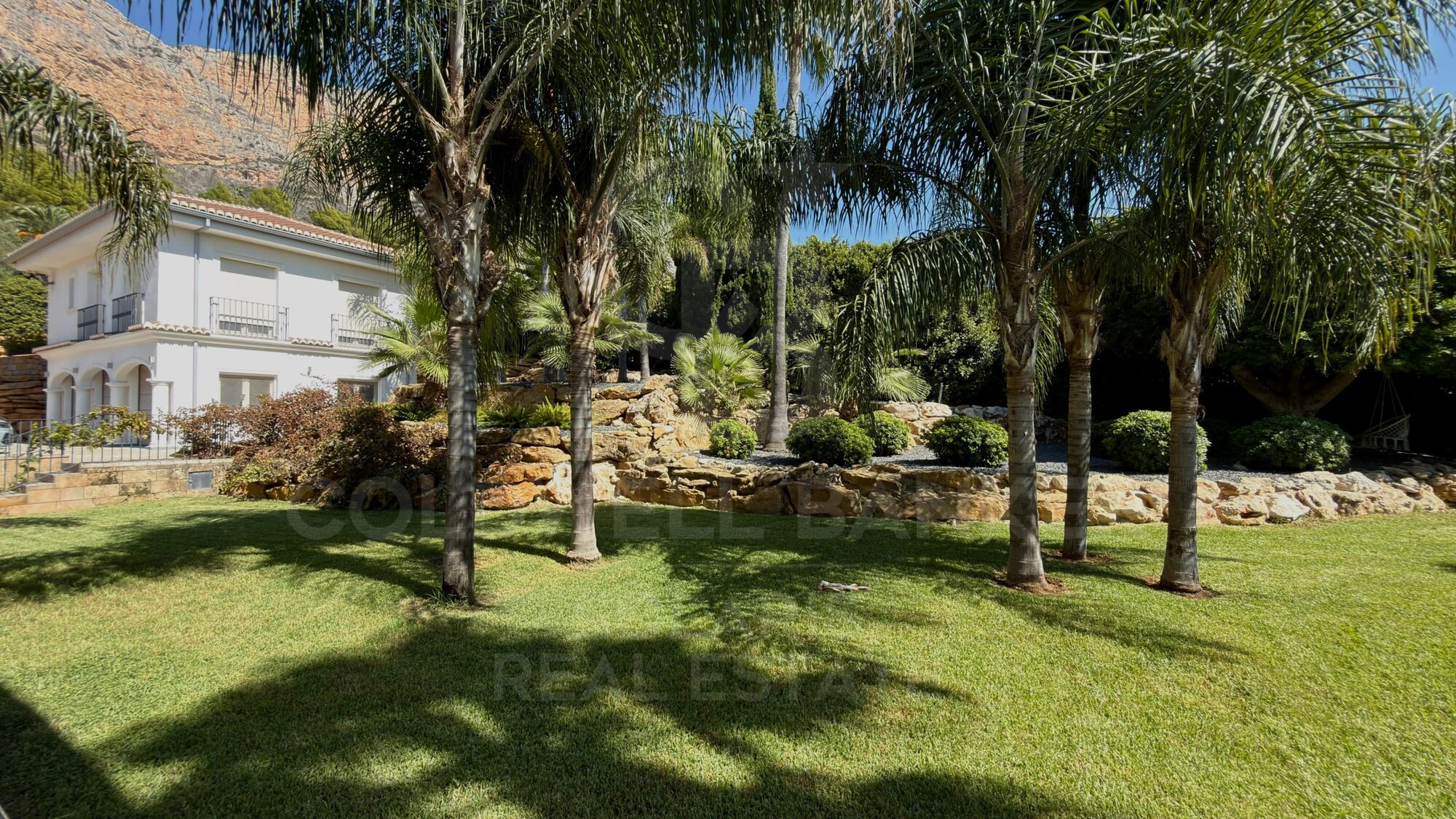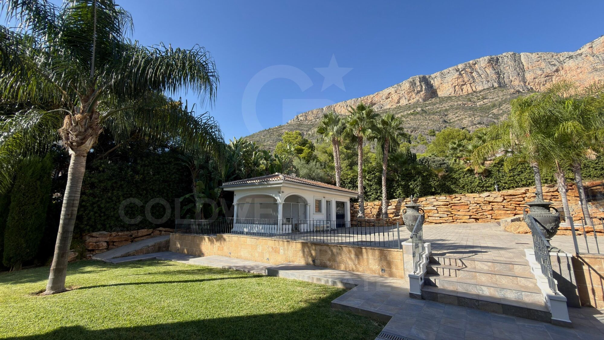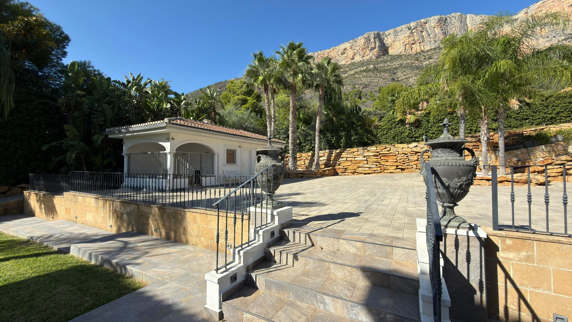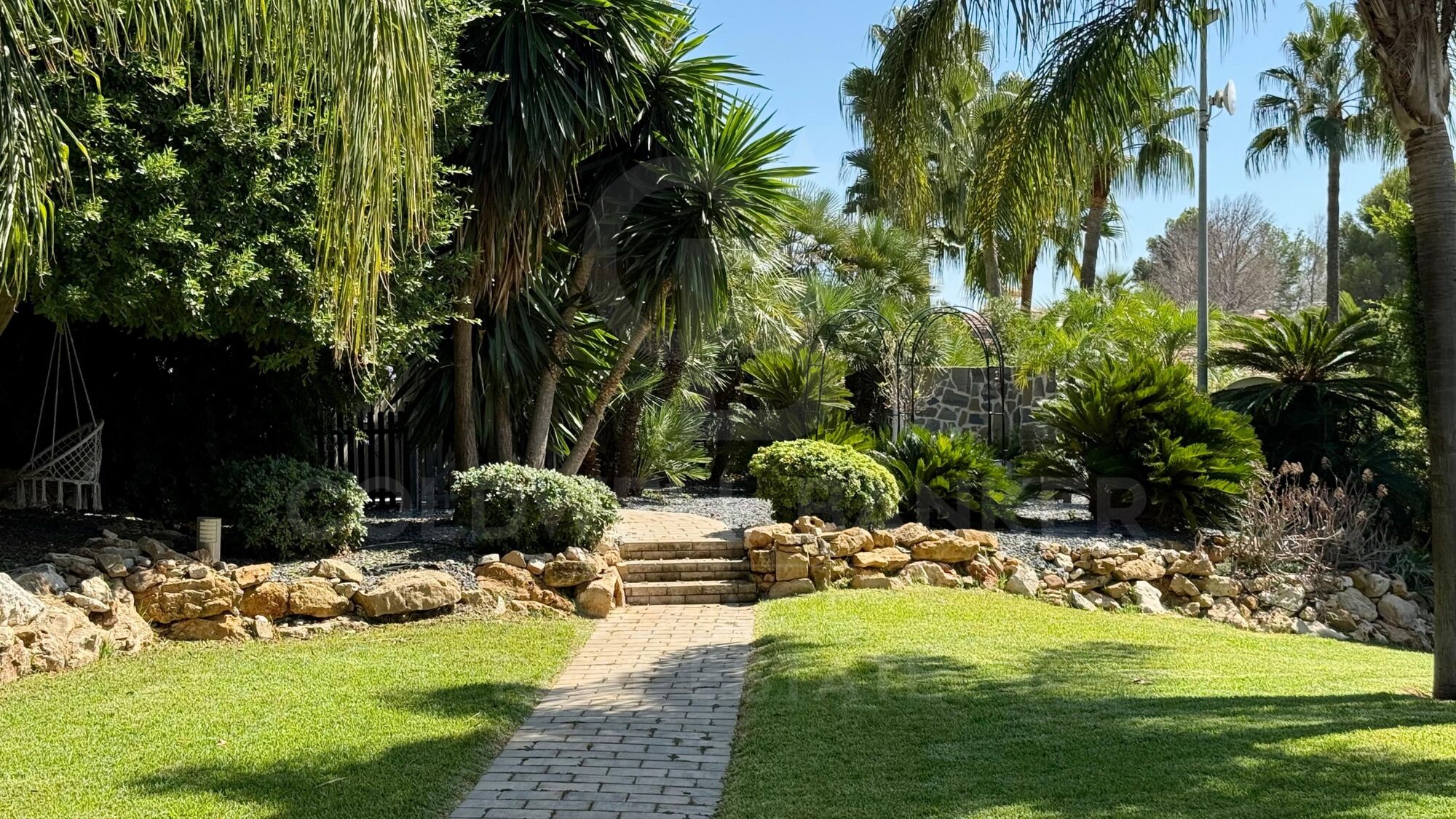 Der wunderschön gestaltete Garten verfügt über mehr als 60 Palmen und üppige mediterrane Pflanzen, die alle von einem automatischen Bewässerungssystem gepflegt werden, das von der Hausautomation gesteuert wird.