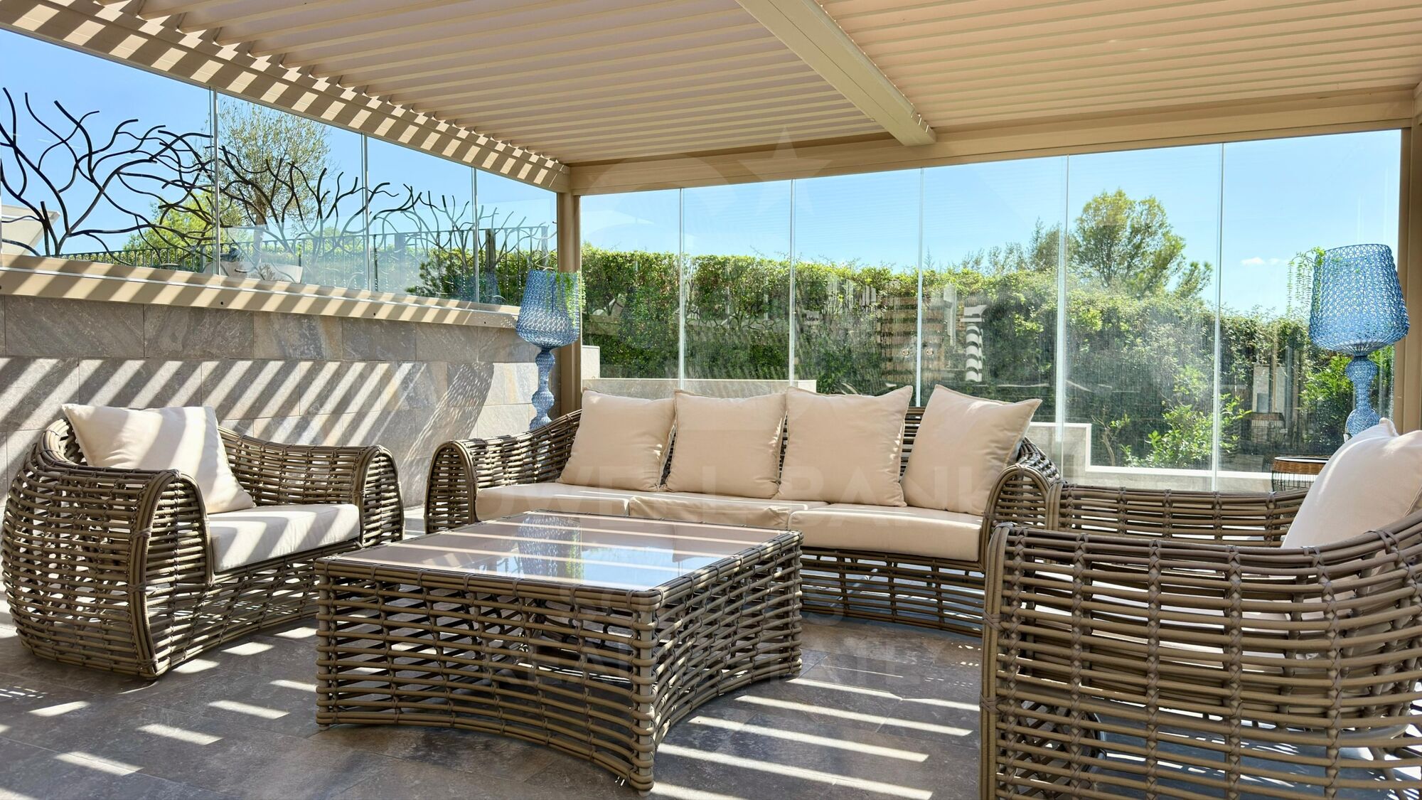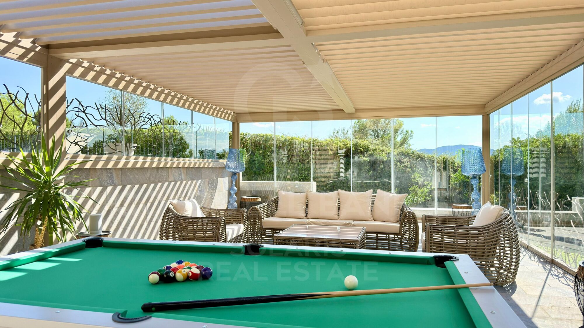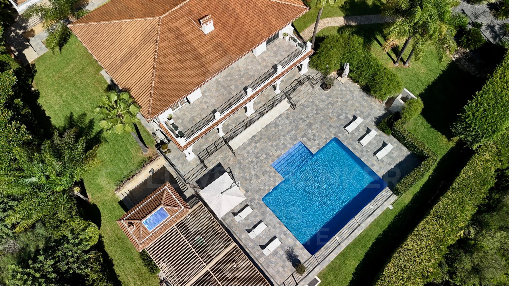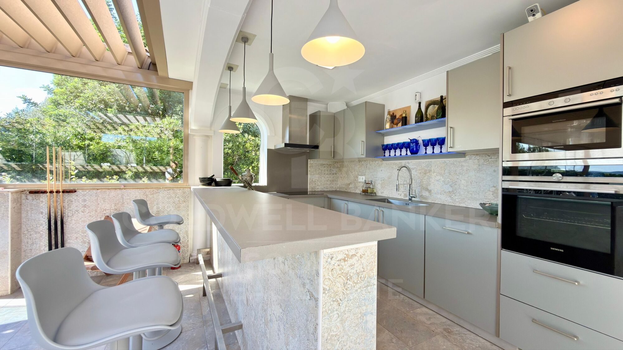 Die Villa bietet mehrere Außenbereiche, die sowohl zur Entspannung als auch zur Unterhaltung konzipiert sind. Eine voll ausgestattete Sommerküche mit automatischem Dach und Grill macht ihn ideal für das Essen im Freien.