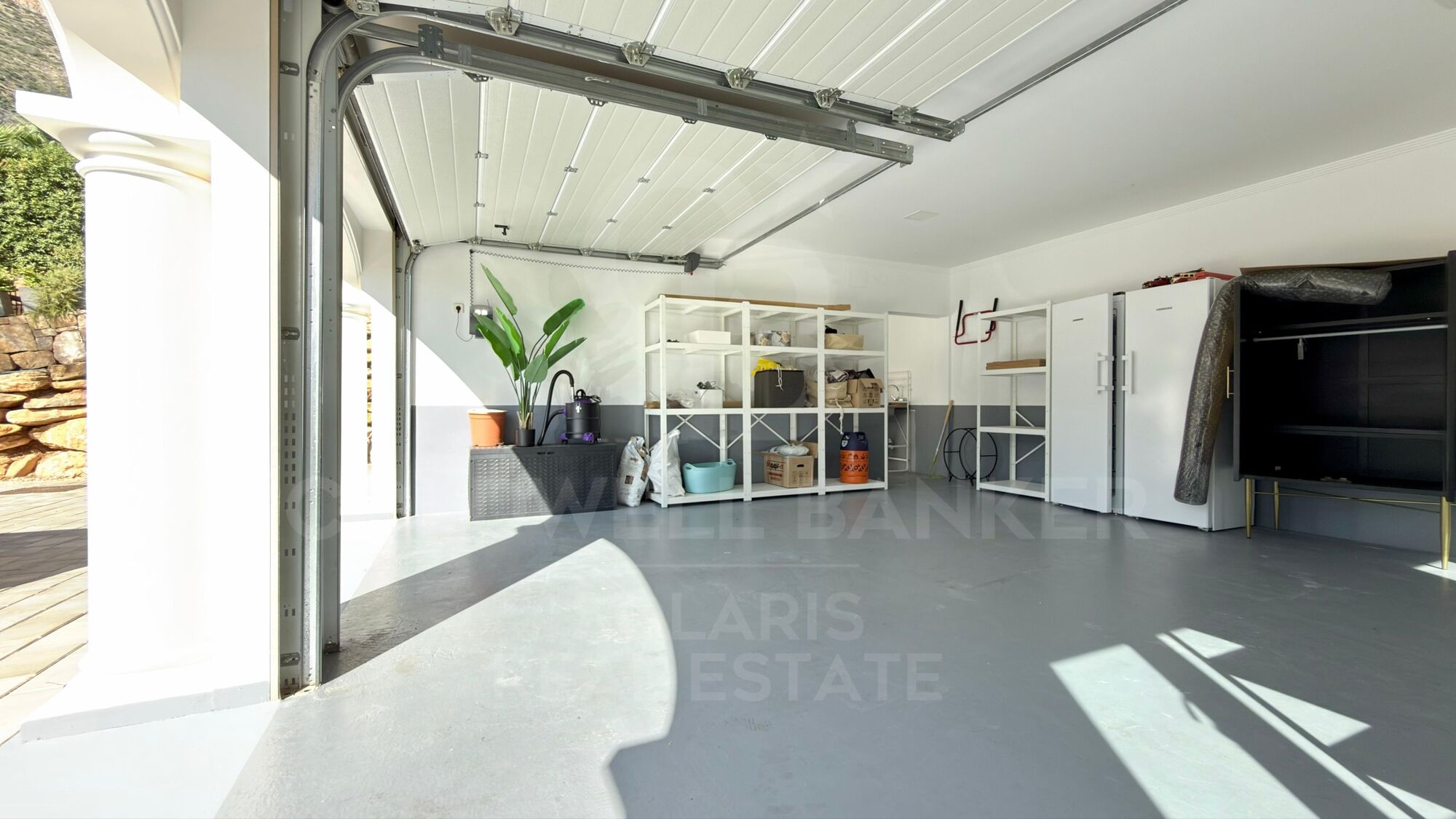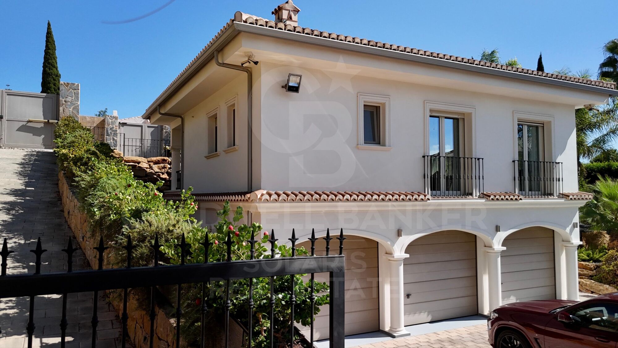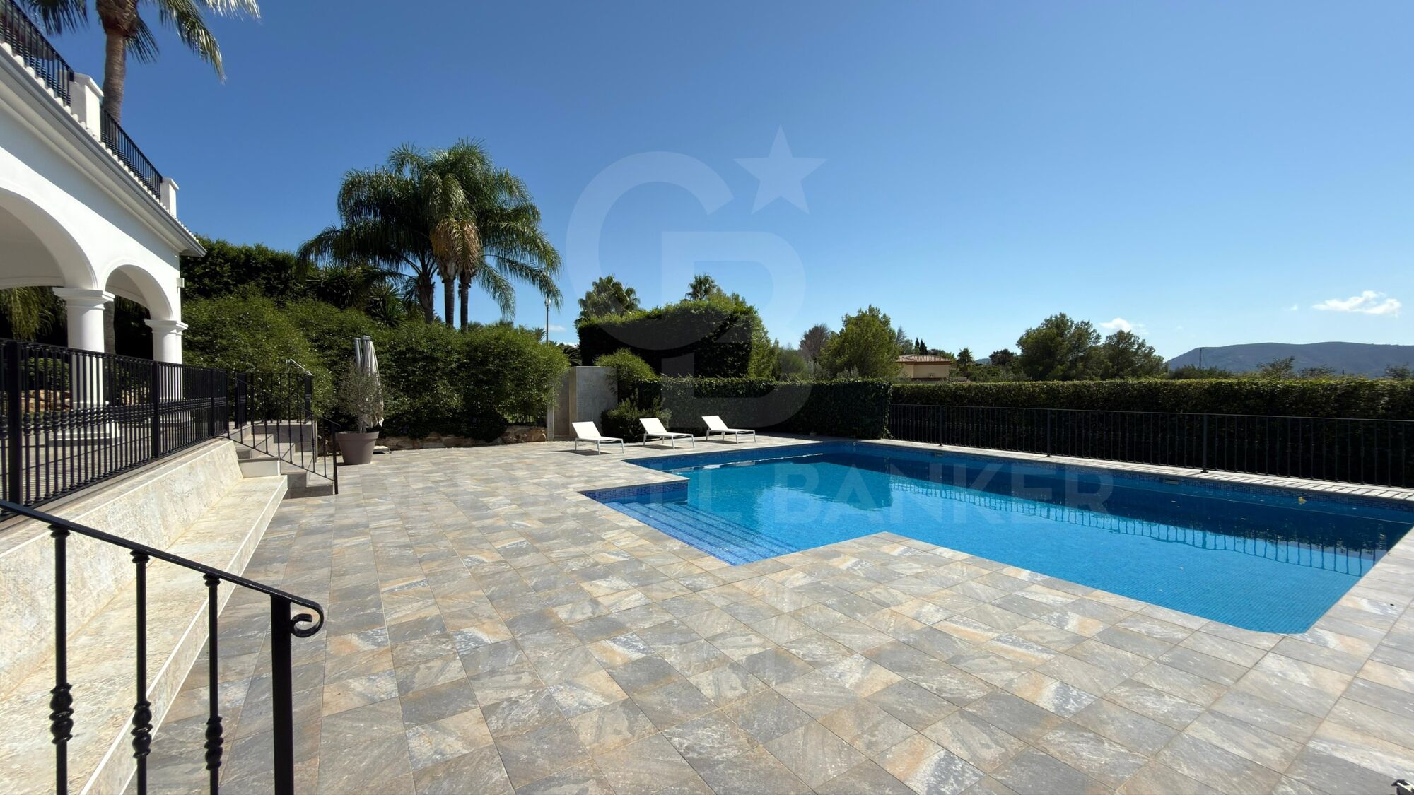 Die Villa ist über zwei automatische Türen zu einer großen Haupthalle zugänglich. Der gesamte Umfang ist mit verstärkten Zäunen gesichert, die Privatsphäre und Sicherheit garantieren und zudem für Haustiere angepasst sind.