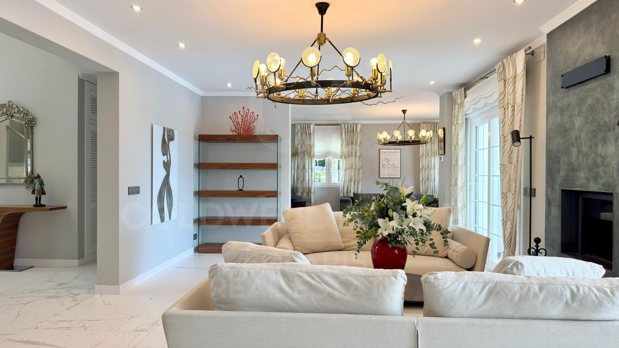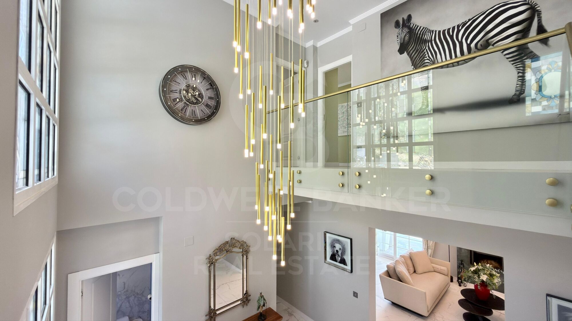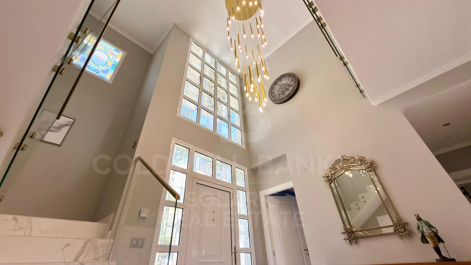 Im Erdgeschoss empfängt Sie eine spektakuläre Eingangshalle mit doppelt hohen Decken und Buntglasfenstern mit reichlich natürlichem Licht. Der Hauptwohnbereich verfügt über einen funktionalen Kamin mit handbemalten goldenen Akzenten, während ein zweites Wohnzimmer für Unterhaltung konzipiert ist und mit einem übergroßen Fernseher und automatischen Jalousien ausgestattet ist.