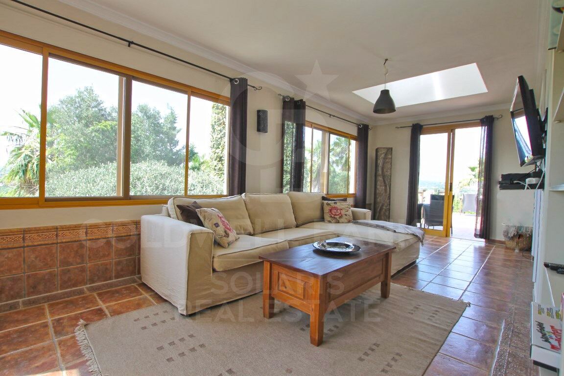 Das Obergeschoss besteht aus einem großen und unverwechselbaren runden Wohnzimmer, dieser wunderbare Bereich vermittelt das Gefühl, das Herz des Hauses zu sein, und bietet schöne Merkmale wie Terrakottaböden, Holzbalkendecken und viele Bogenfenster mit herrlichem Blick über das Tal und den Montgo. Über diesem Wohnzimmer befindet sich eine wunderschöne Dachterrasse, die perfekte Chill-Out-Area. Auf dieser Ebene befindet sich auch eine weitere Gästesuite.