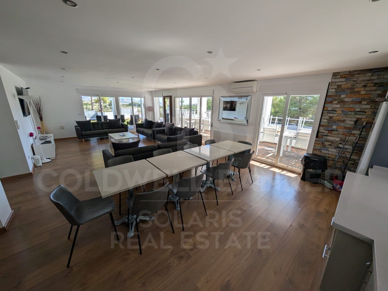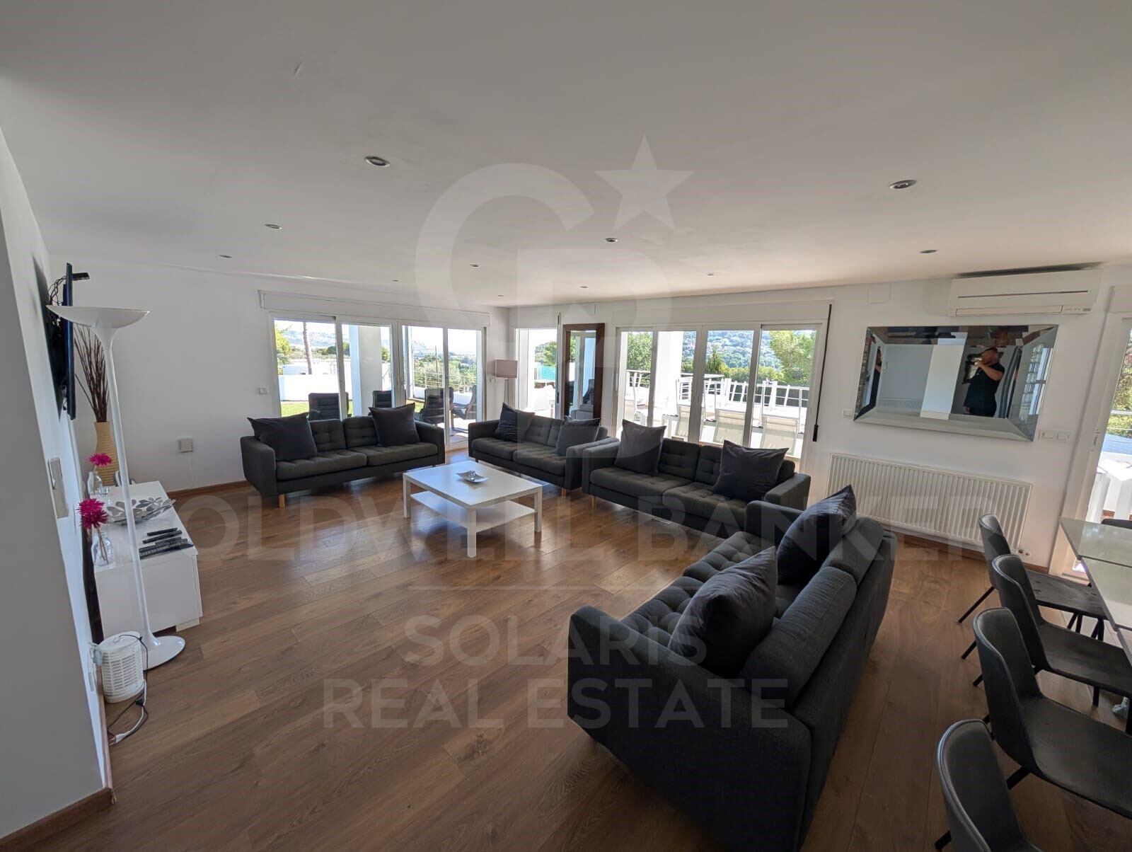Die Villa erstreckt sich über drei Etagen und verfügt über ein offenes Wohnzimmer, das das Esszimmer und eine moderne Küche integriert, mit großen Fenstern, die die Räume mit natürlichem Licht durchfluten und zu einem großen umlaufenden Balkon mit spektakulärer Aussicht führen. Drei der sieben Schlafzimmer verfügen über ein eigenes Bad, dazu kommen zwei Familienbäder und ein Gäste-WC. Im Untergeschoss befindet sich ein großes Spielzimmer, das mit einem Billardtisch und einem Unterhaltungsbereich ausgestattet ist und sich perfekt zum Genießen mit Familie oder Freunden eignet. Alle Haupträume verfügen über eine Klimaanlage warm/kalt für mehr Komfort das ganze Jahr über.