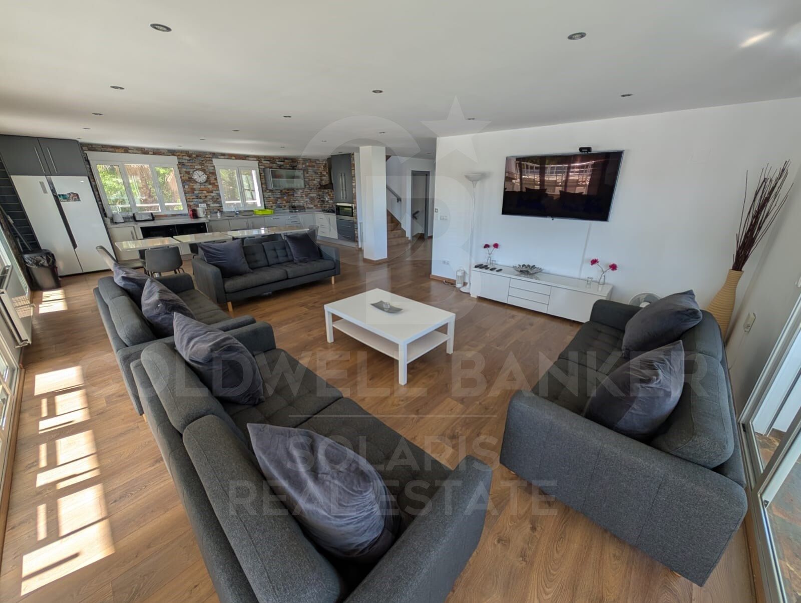 Die Villa erstreckt sich über drei Etagen und verfügt über ein offenes Wohnzimmer, das das Esszimmer und eine moderne Küche integriert, mit großen Fenstern, die die Räume mit natürlichem Licht durchfluten und zu einem großen umlaufenden Balkon mit spektakulärer Aussicht führen. Drei der sieben Schlafzimmer verfügen über ein eigenes Bad, dazu kommen zwei Familienbäder und ein Gäste-WC. Im Untergeschoss befindet sich ein großes Spielzimmer, das mit einem Billardtisch und einem Unterhaltungsbereich ausgestattet ist und sich perfekt zum Genießen mit Familie oder Freunden eignet. Alle Haupträume verfügen über eine Klimaanlage warm/kalt für mehr Komfort das ganze Jahr über.