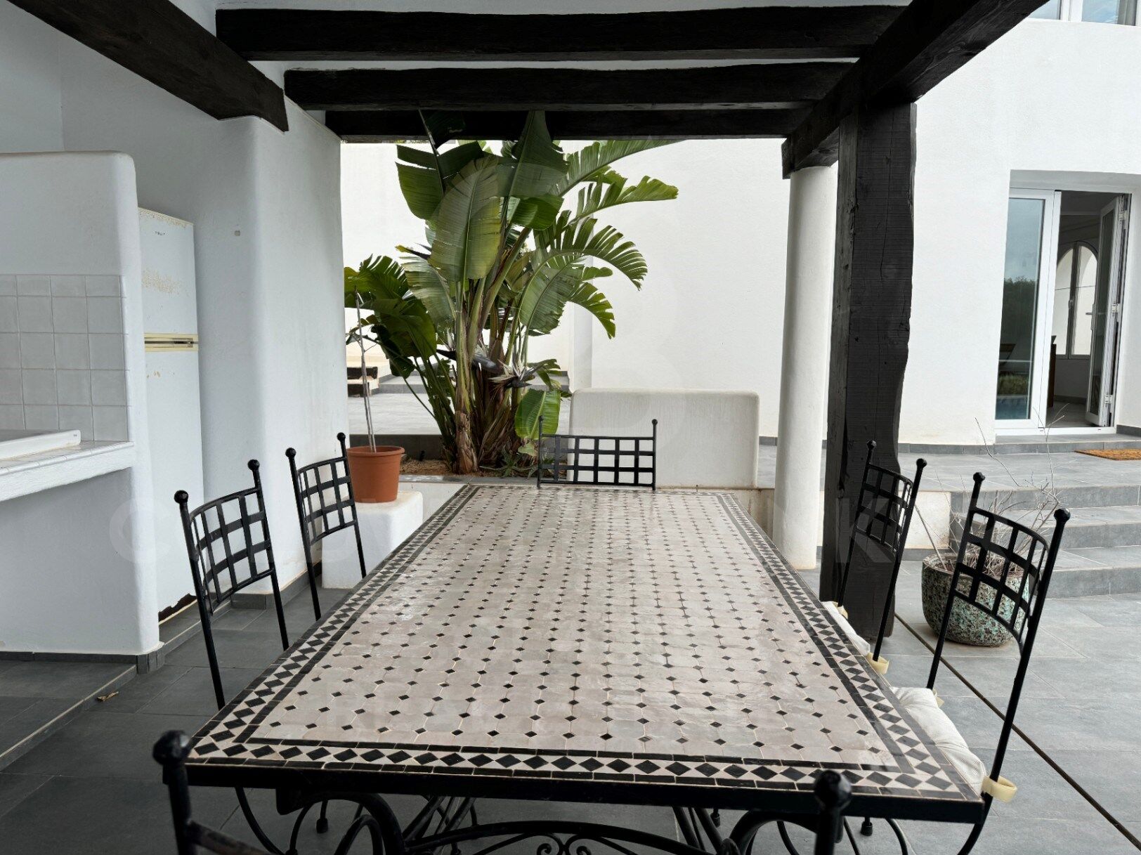 Auf einer oberen Ebene öffnet sich ein gemütlicher Flur zu einem geräumigen, offenen Wohn-Esszimmer. Beide sind so konzipiert, dass sie das natürliche Licht maximieren und eine warme und einladende Atmosphäre schaffen. Die Küche, die komplett mit hochwertigen Geräten und einer großzügigen Mittelinsel ausgestattet ist, ist der perfekte Ort, um Momente mit Familie und Freunden zu genießen. Die Villa verfügt über eine Klimaanlage für Ihren Komfort und einen Holzkamin, der in den kühleren Monaten einen Hauch von Wärme verleiht. Von der Küche aus gelangt man auf eine charmante überdachte Terrasse, auf der man den Meerblick genießen kann. Erklimmen Sie die Wendeltreppe, die Sie zum Solarium auf dem Dach führt, einem perfekten Ort, um sich in der Sonne zu entspannen.