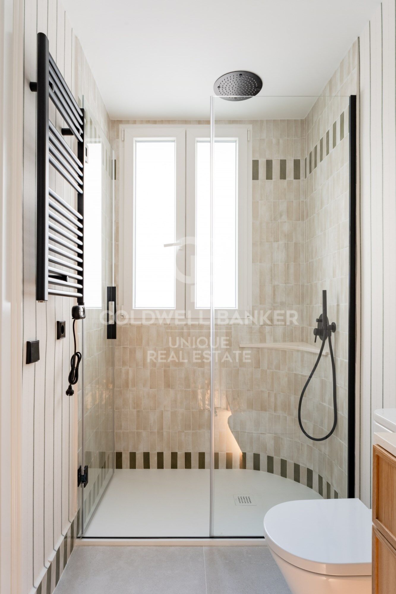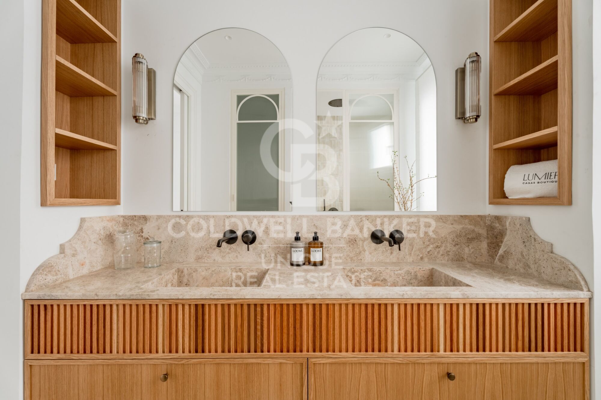 Die Renovierung umfasst edle Materialien und eine sorgfältige Auswahl charakteristischer Elemente: natürliche Eichenböden in Punta Ungarn, Holzfenster, die das Originaldesign nachbilden, restaurierte Fensterläden, ein exklusiv gestaltetes Waschbecken im Hauptbadezimmer, maßgefertigte Tischlerarbeiten in Türen und Schränken, Wandleisten, Gesimse und Putzdecken sowie ein sorgfältiges Beleuchtungsprojekt, das jeden Raum aufwertet.