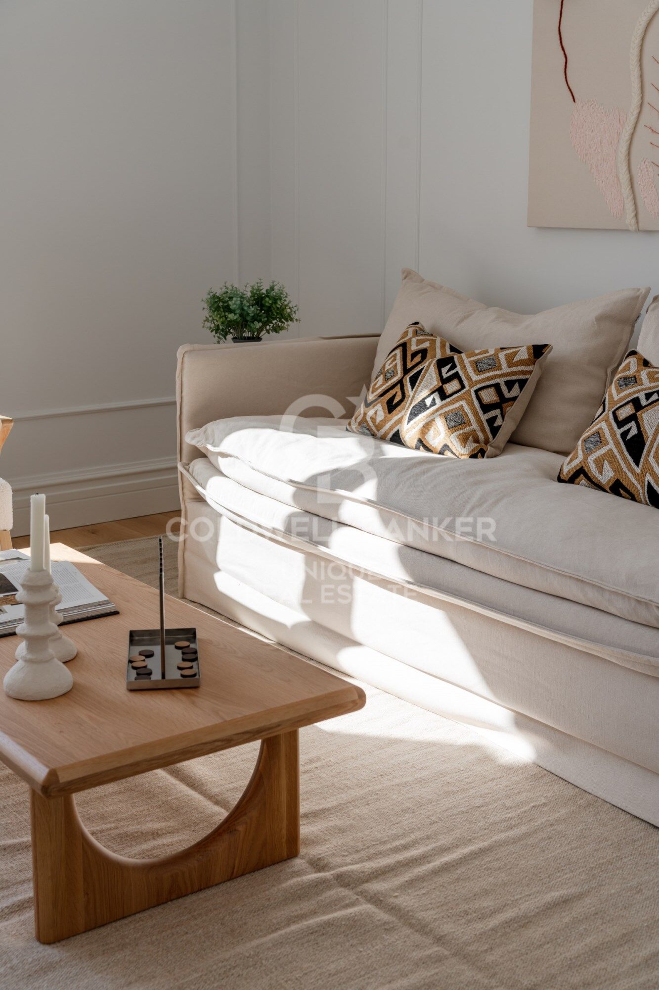 Das Haus ist um einen großen und flexiblen sozialen Bereich organisiert, der als großer durchgehender Raum konzipiert ist, in dem Wohnzimmer und Esszimmer elegant nebeneinander existieren. Zwei Balkone und ein Erkerfenster zur Straße bieten ungehinderte Sicht und außergewöhnliches Licht, das durch die Höhe des Bodens verstärkt wird. Die Nord-Süd-Ausrichtung und die Eckposition lassen das Grundstück den ganzen Tag über durch natürliches Licht tauchen und verstärkt das Gefühl der Weite. Das Wohnzimmer ist durch gekannte Holzmundstücke, die architektonischen Charakter verleihen, mit der Küche verbunden, während beide Räume Decken bis zu 2,80 Meter hoch und stilisierte Balkone von 2,60 Metern bieten - Elemente, die die Vertikalität und Eleganz des Ganzen unterstreichen.