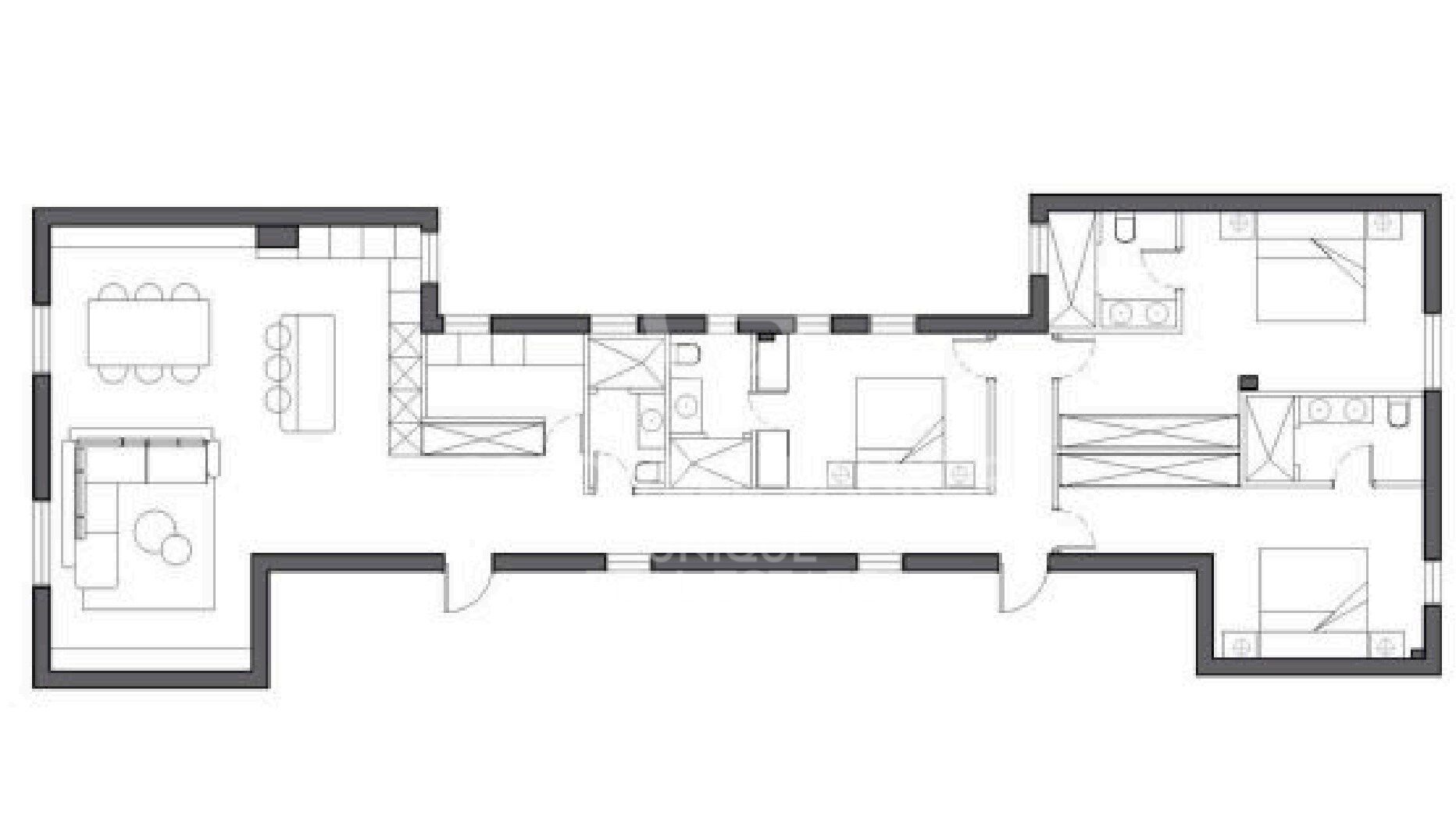 Der großzügige Wohn-Ess-Küchenbereich bildet das Herzstück der Wohnung, ein offenes und modernes Ambiente, das auf Komfort und Stil ausgelegt ist.