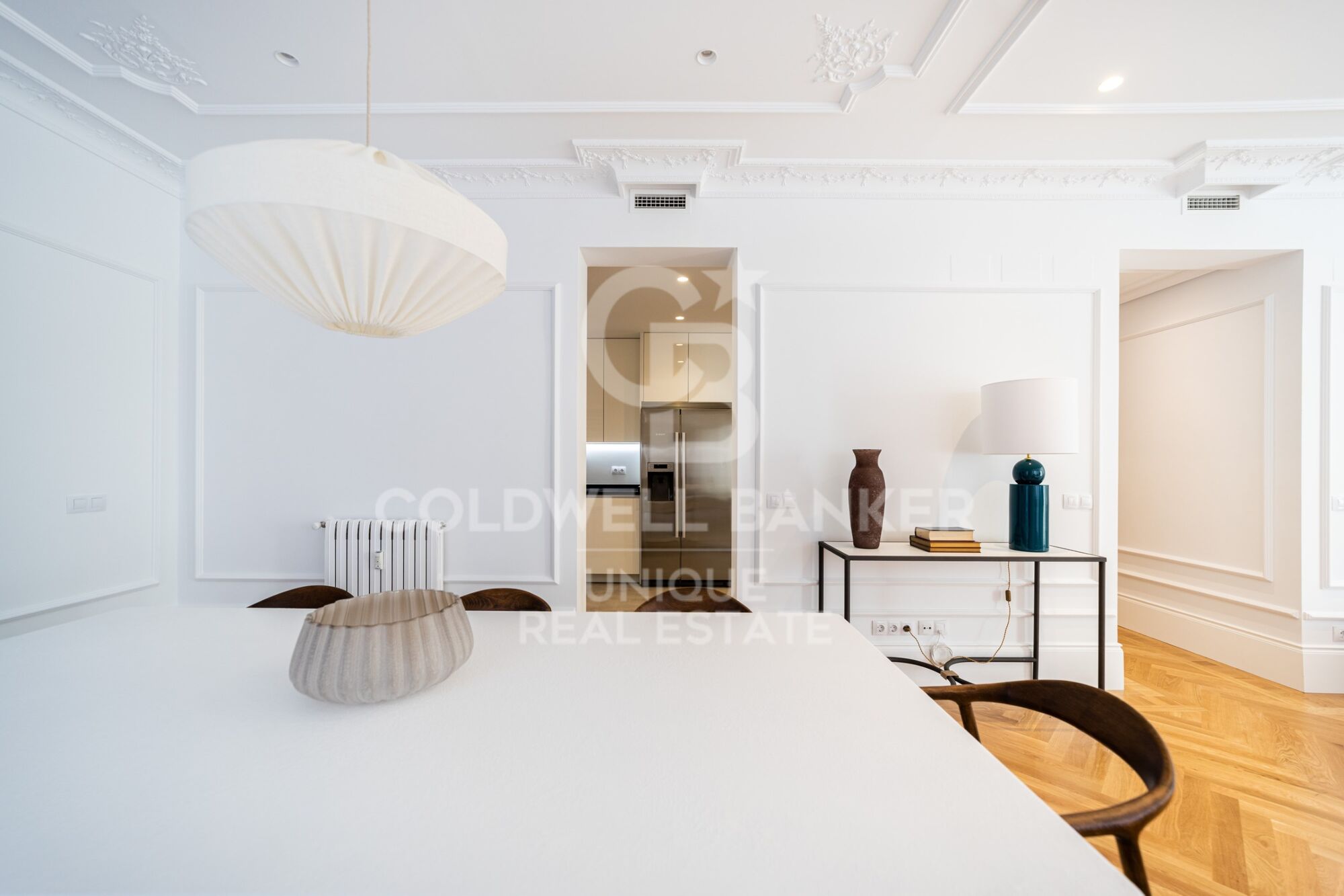 Die Immobilie verfügt über eine geräumige Eingangshalle, die zu einer modernen, halboffenen Küche führt, die mit den neuesten Geräten ausgestattet ist und sich auf natürliche Weise in den sozialen Raum integriert. Das helle und elegante Wohn-/Esszimmer wird von drei großen, nach Westen ausgerichteten Fenstern eingerahmt, die den Raum am Nachmittag in Licht tauchen und einen schönen Blick auf die Straße bieten.