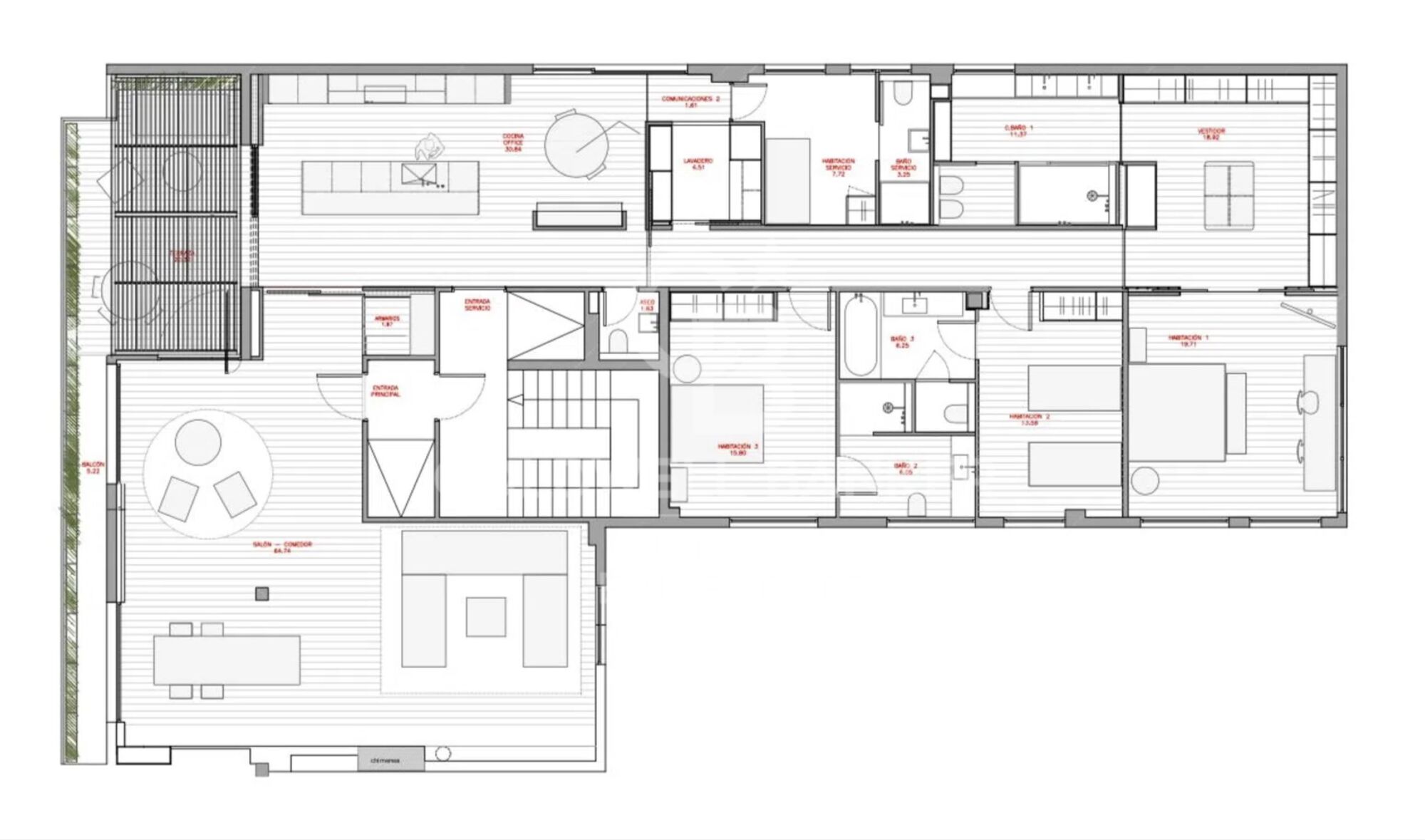 Im achten Stock nach Süden gelegen, bietet das Penthouse spektakuläre offene Ausblicke auf die Skyline von Madrid, hohe Decken und eine große Terrasse, die das ganze Jahr über ideal ist, um die Natur zu genießen. Das Haus verfügt über vier Schlafzimmer, einen Abstellraum und einen Portier, was es zu einem echten High-Level-'Turnkey' macht.