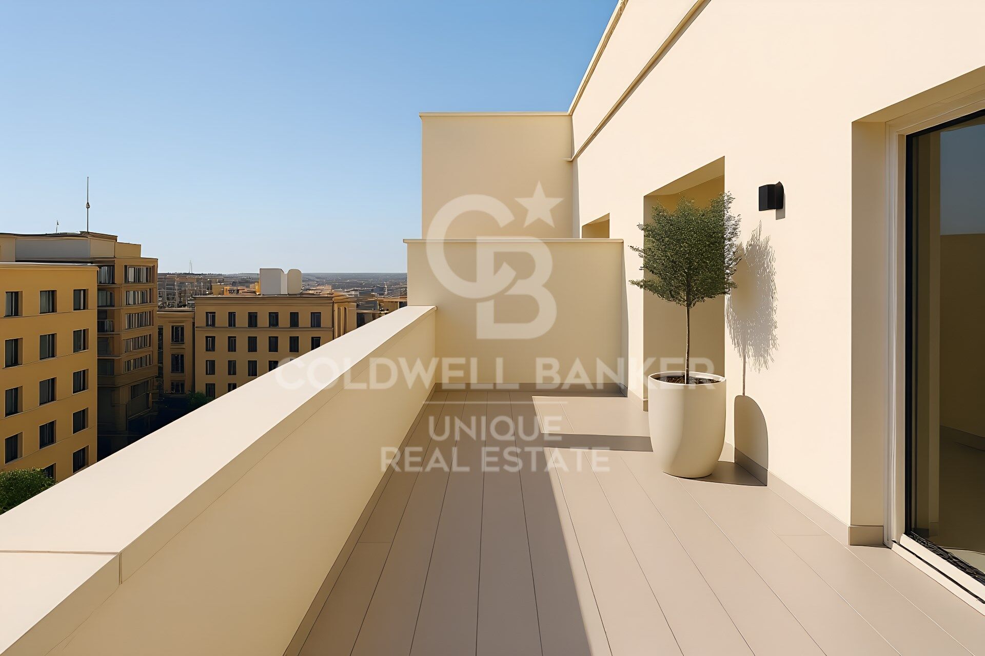 Das Penthouse liegt im sechsten Stock und besticht durch seine angenehme Terrasse, ideal, um das Leben im Freien im Herzen der Stadt zu genießen.