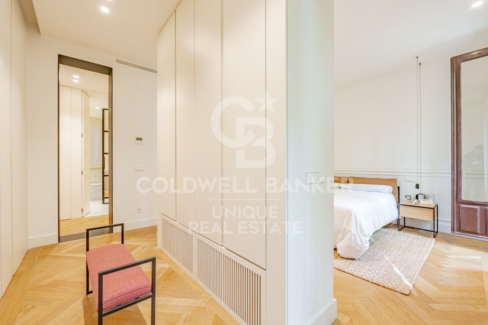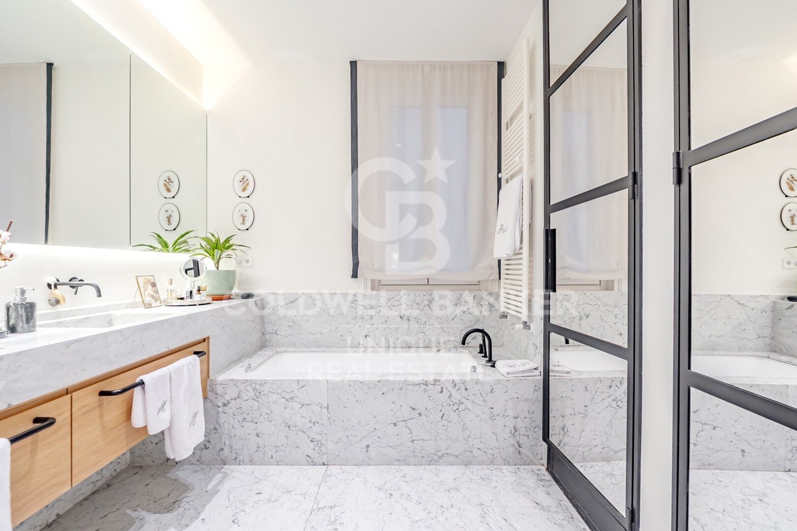 Diese außergewöhnliche Immobilie befindet sich im zweiten Stock eines herrschaftlichen Anwesens, das 2024 komplett renoviert wurde, und bietet 380 m² bebaute Fläche, die mit Eleganz und Funktionalität verteilt sind. Es verfügt über vier geräumige Schlafzimmer, drei davon nach außen, und vier Badezimmer, die alle mit exquisitem Geschmack gestaltet sind.