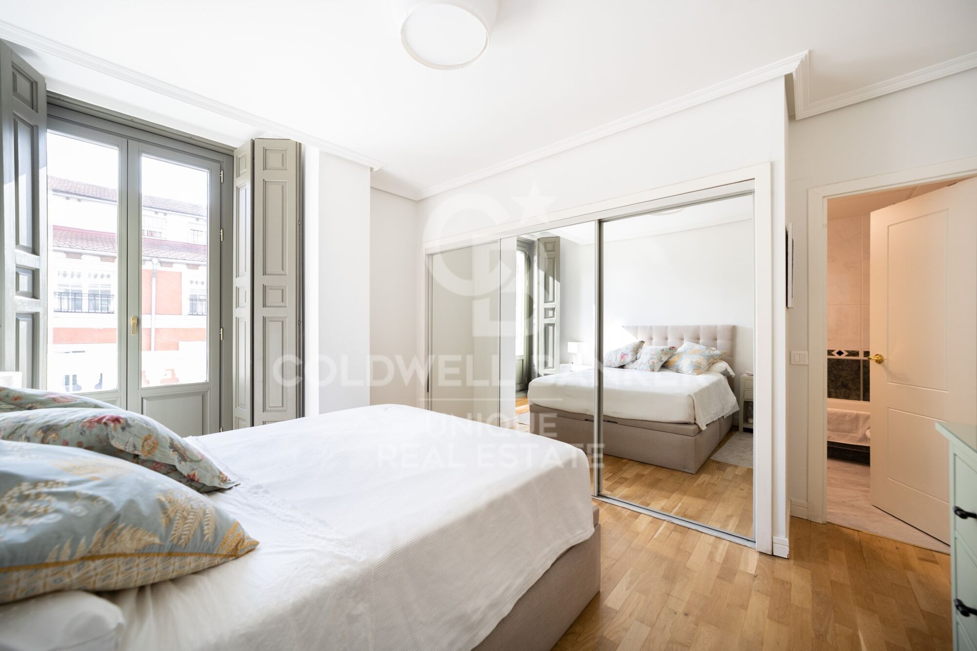Die Wohnung liegt in einer oberen Etage und ist nach Südosten ausgerichtet. Sie ist vollständig außenliegend und besticht durch ihre Helligkeit und den freien Blick auf zwei Straßen. Der Grundriss ist funktional und ausgewogen, mit zwei Schlafzimmern jeweils mit eigenem Bad, einer separaten Küche, einem Eingangsbereich und Flur mit großen Einbauschränken sowie einem beeindruckenden Wohn- und Esszimmer, das durch seine großen Fenster mit natürlichem Licht durchflutet wird.