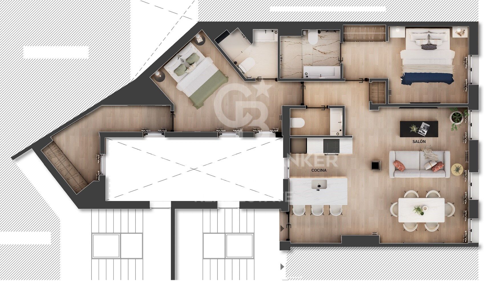 Der Schlafbereich umfasst zwei Schlafzimmer und zwei voll ausgestattete Badezimmer sowie ein zusätzliches Gäste-WC, das für zusätzliche Funktionalität sorgt.